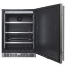 This 24" Professional compact built-in refrigerator from Silhouette features a stainless steel kick and handle, electronic thermostat, white and blue LED lighting, reversible door, and automatic defrost.