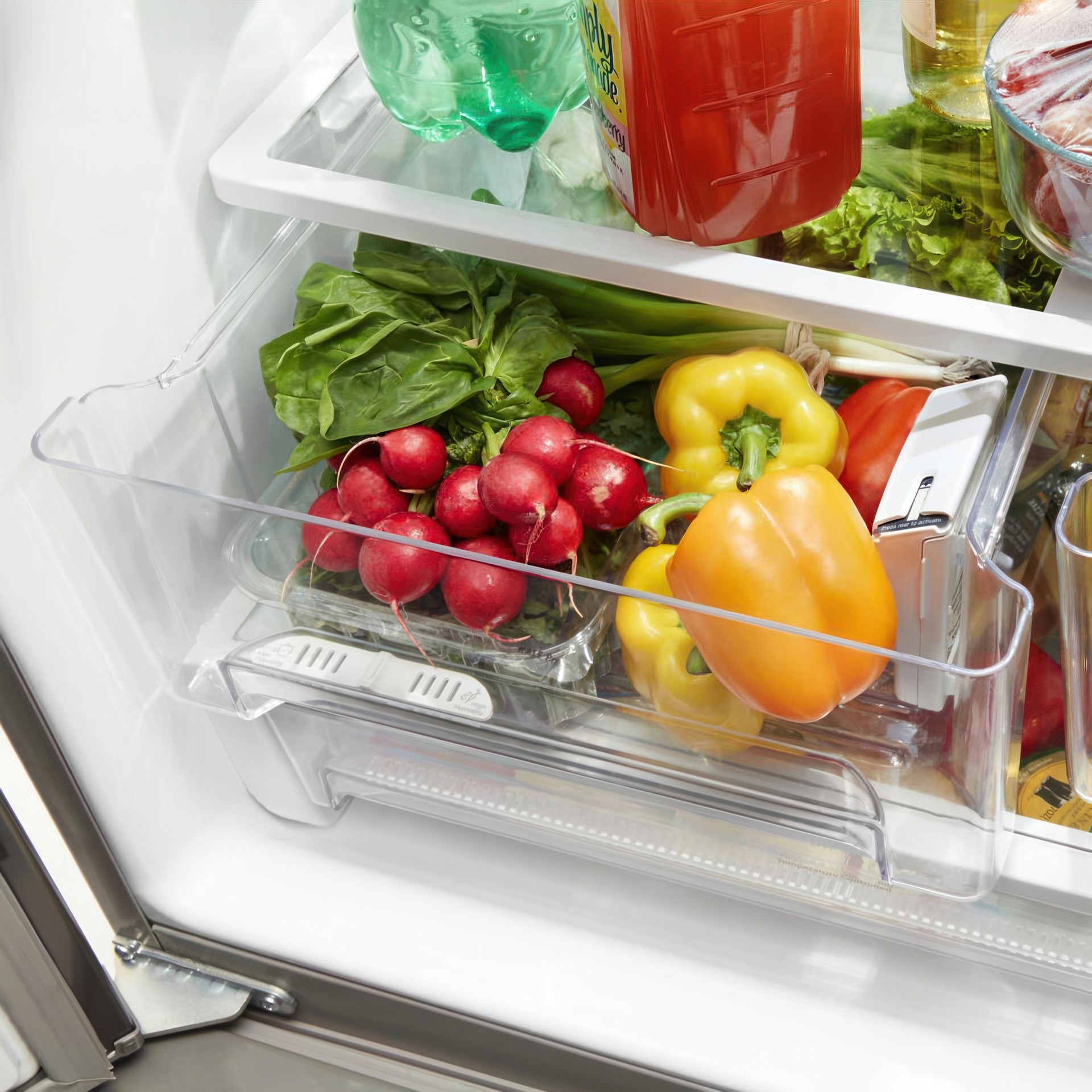 Moisture-controlled crispers allow you to store fruits and vegetables in their ideal environment while the retractable shelf frees up space for tall items like 2-liter bottles.