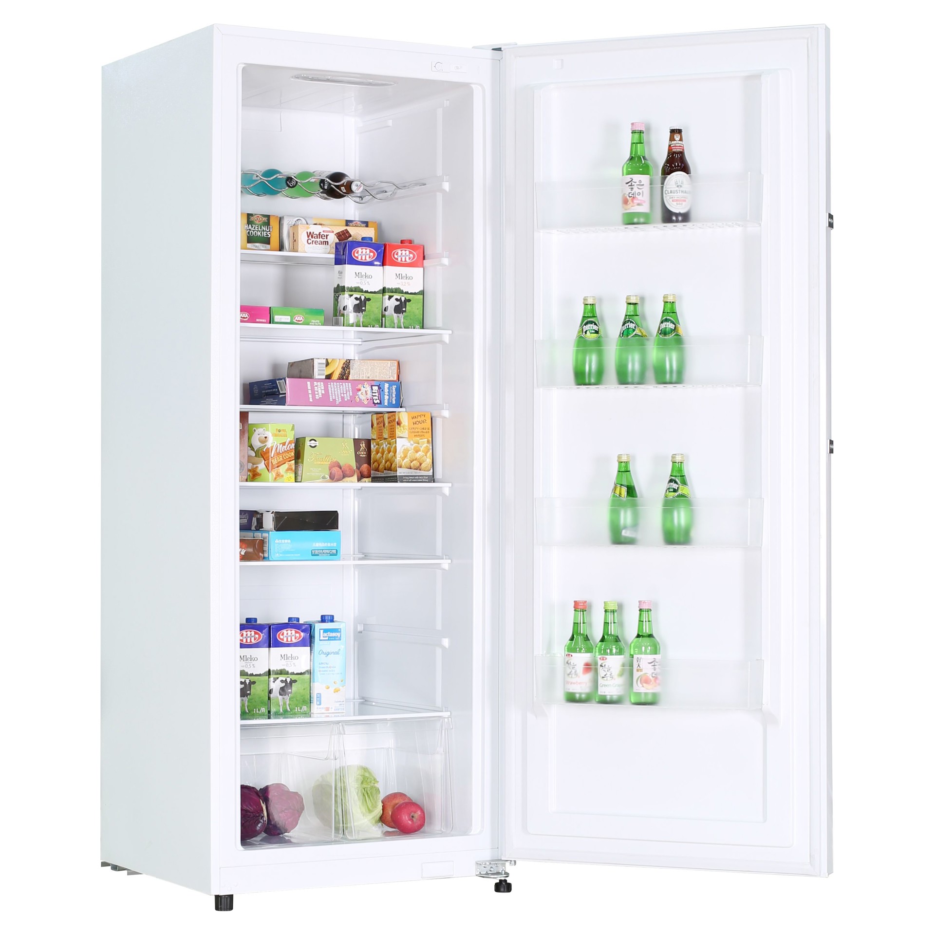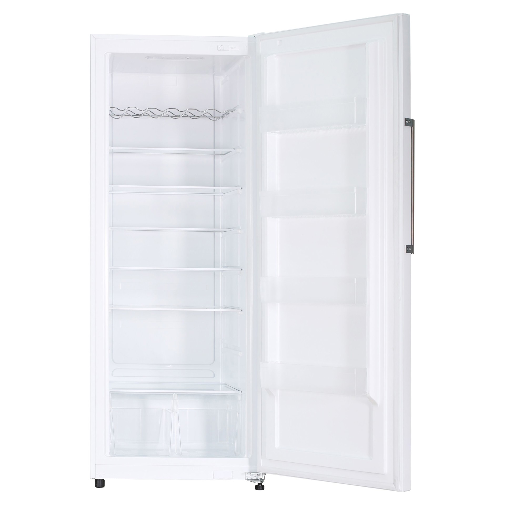 It also includes 4 full width door rails, a chrome wine rack and 2 crisper drawers. The door swing can be reversed for added versatility.