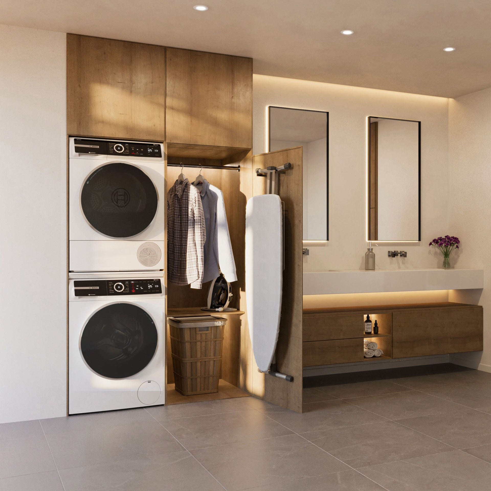 The Bosch 24” compact dryer can be installed stacked, side-by-side, on pedestals, in a closet or under a counter.