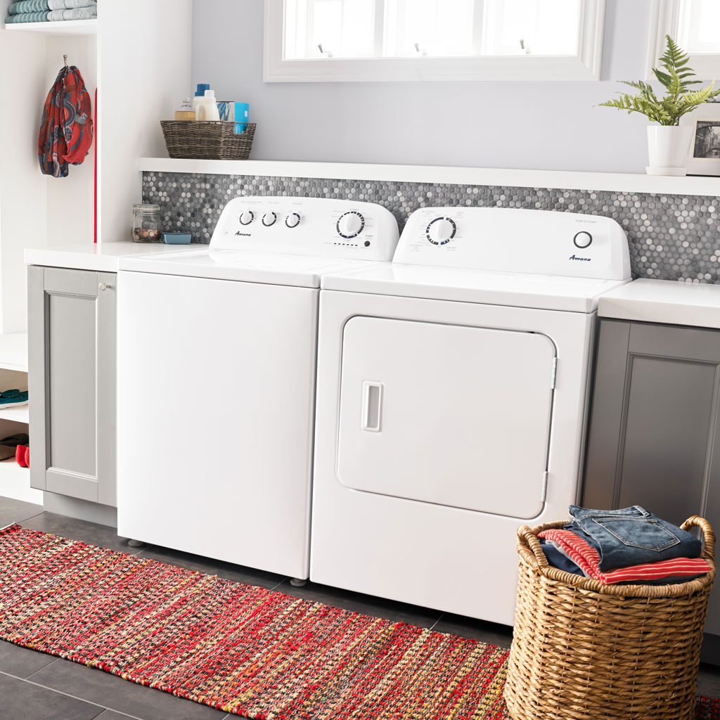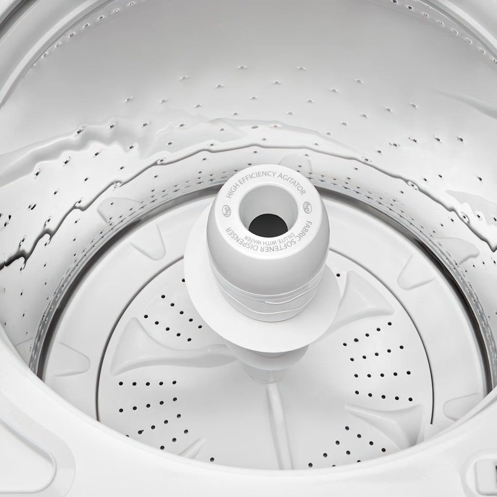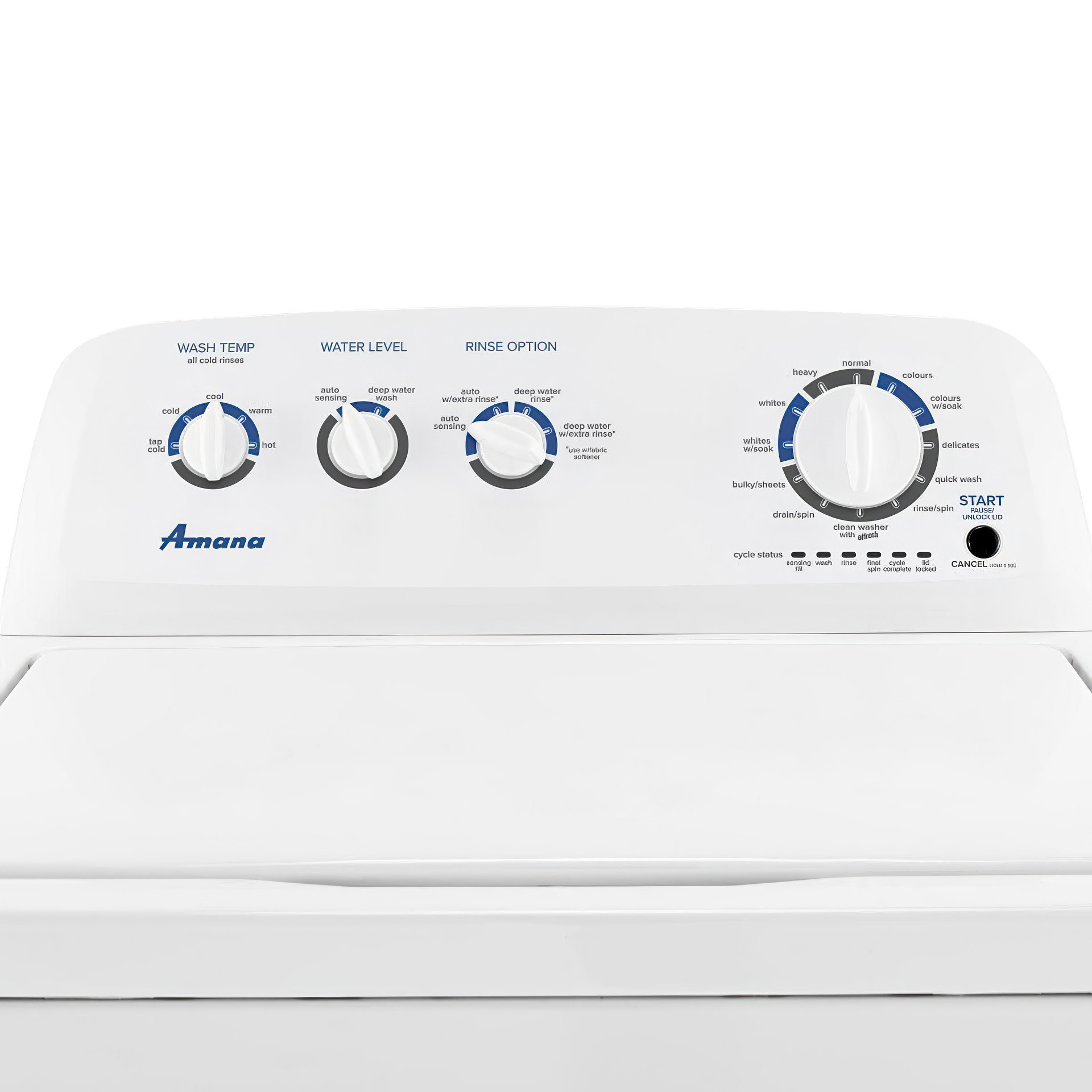 This Amana® 4 cu. ft. top-loading washer provides fast, even cleaning thanks to a dual-action agitator, which agitates clothes in the bottom of the wash basket.