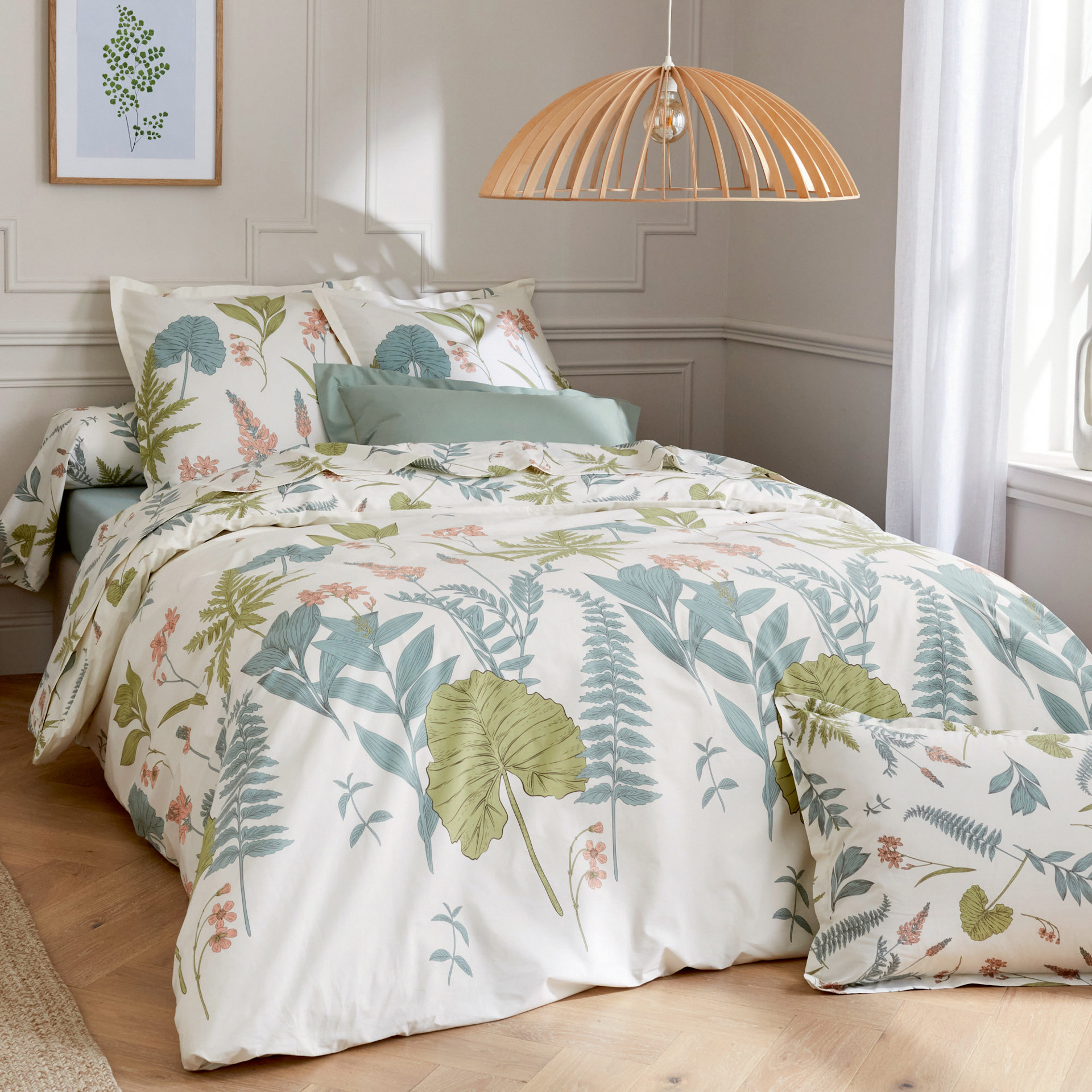 Duvet cover and pillow sham set in 200 thread count cotton percale. The printing at the heart of the fiber gives high color fastness, and the easy care treatment gives an incredibly supple feel to the fabric.