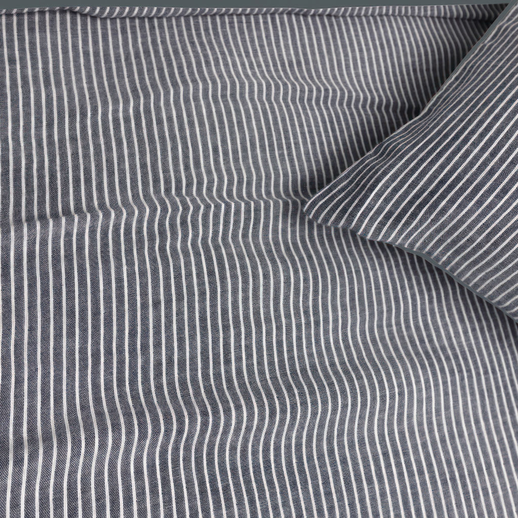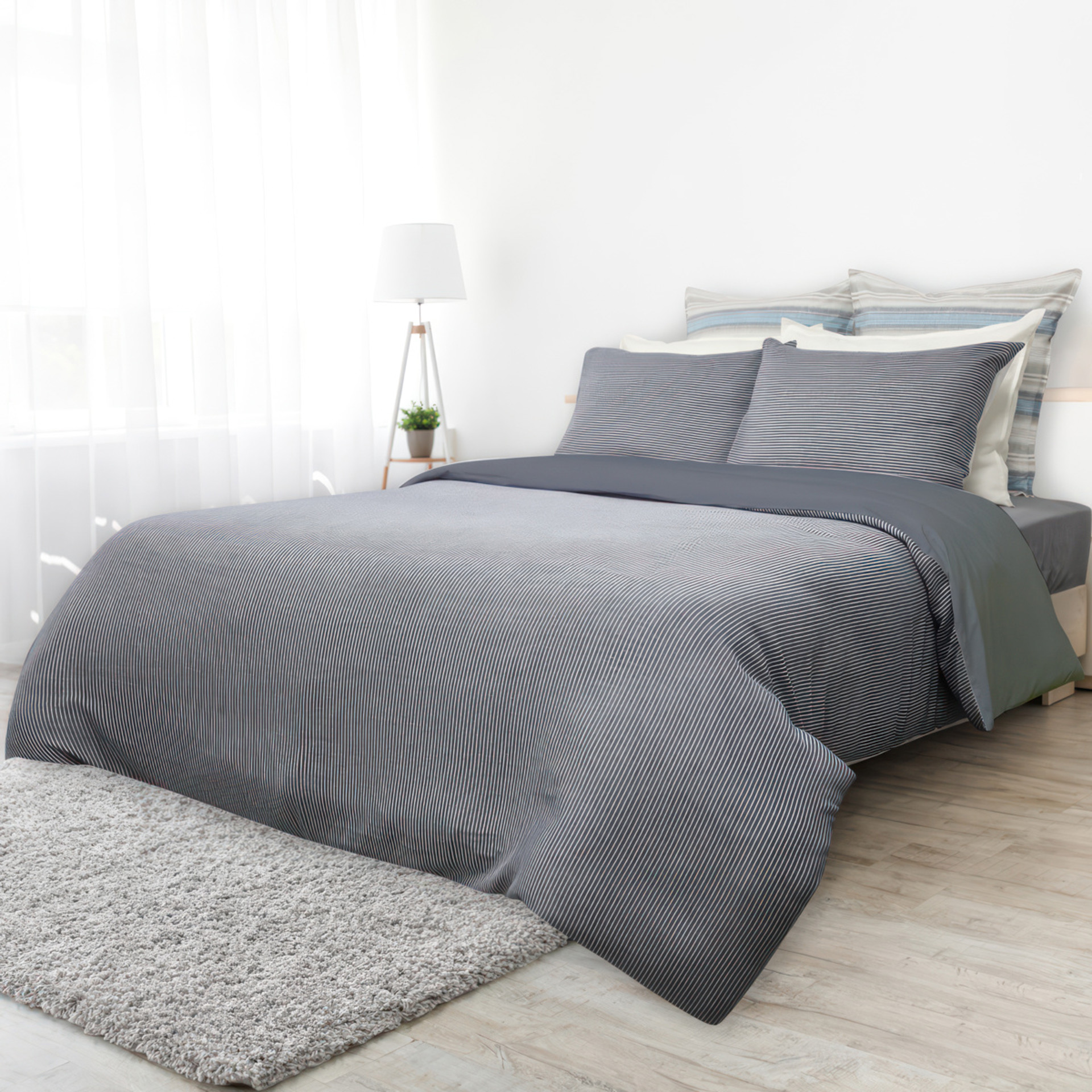 Promesse queen duvet cover and 2 pillow shams set. Promesse's thin white stripes on an ash background are a perfect balance of classic allure and casual chic.