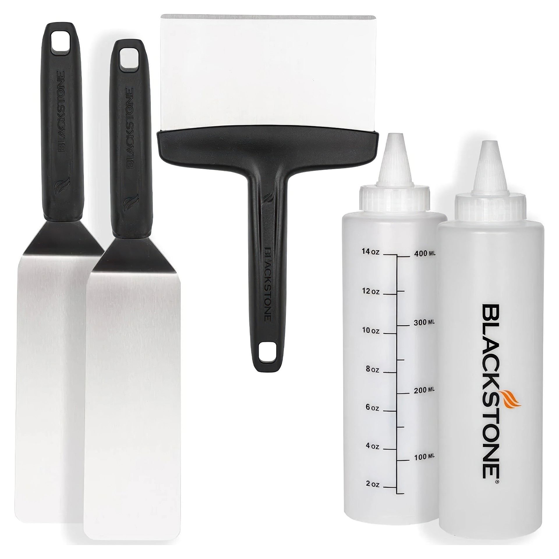 Get griddling right away with your griddle essentials tool kit. With a beveled edge scraper, two stainless steel spatulas, and two 16 oz. squeeze bottles.  You're all set to rediscover the joy of cooking on your Blackstone Griddle.  This set contains everything you need to prepare the meals you love!