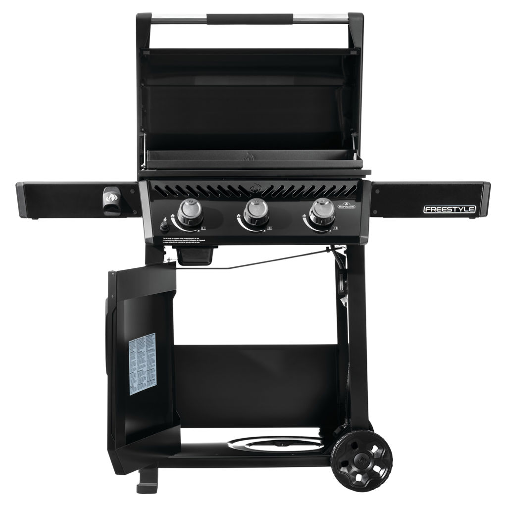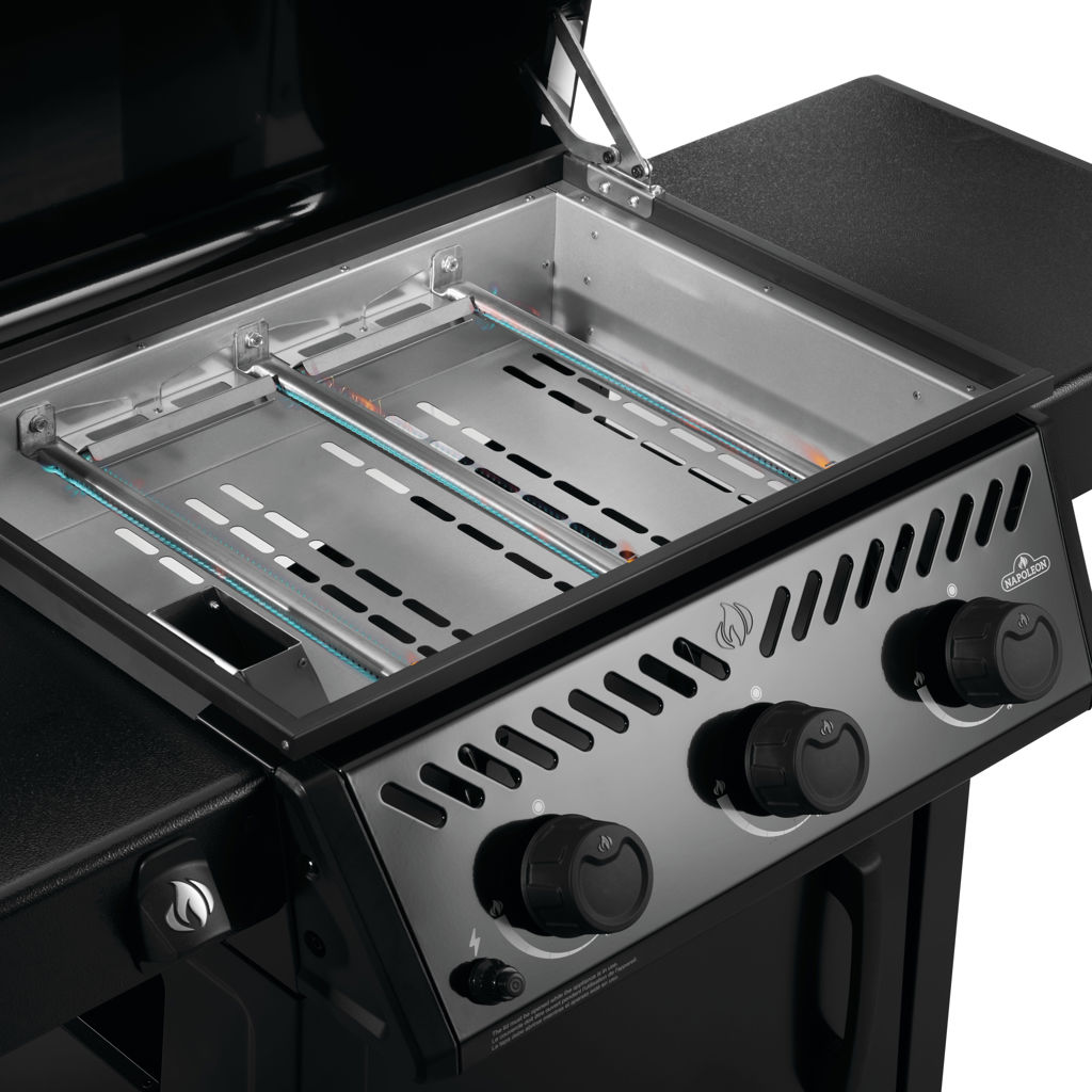 Durable gloss black body and controls with rust-resistant, reimforced, pre-seaspned steel cooktop stands up to any weather