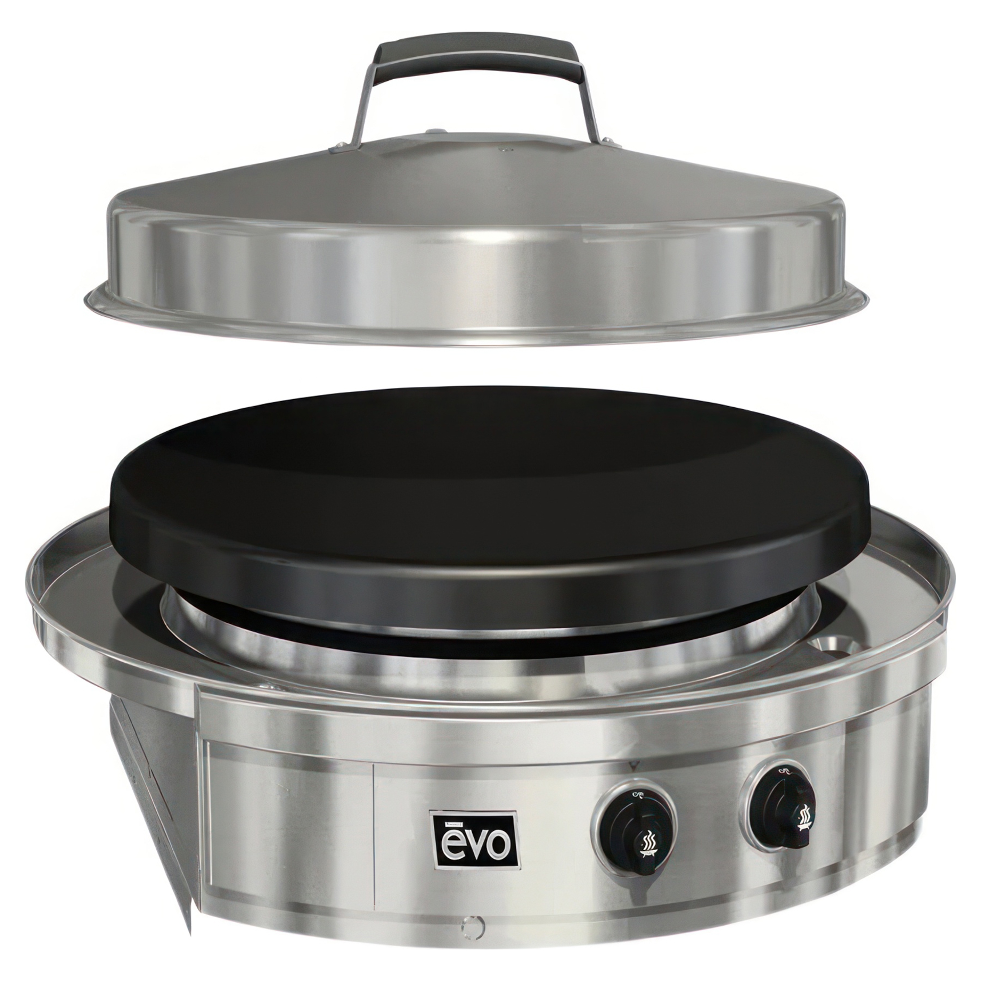 Indirectly, you can boil, braise, poach or fry. Cover the cooking surface with the stainless steel hood to convert the Evo Affinity 25G grill into a patio oven.