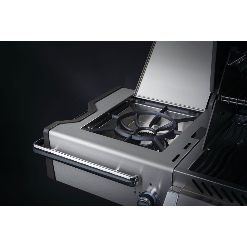 The Prestige PRO™ 825 also has a two-stage power side burner with a reversible cooking grid ideal for sauces, sautes and side dishes. Enjoy evenly cooked restaurant style meals with the rear infrared burners and rotisserie.