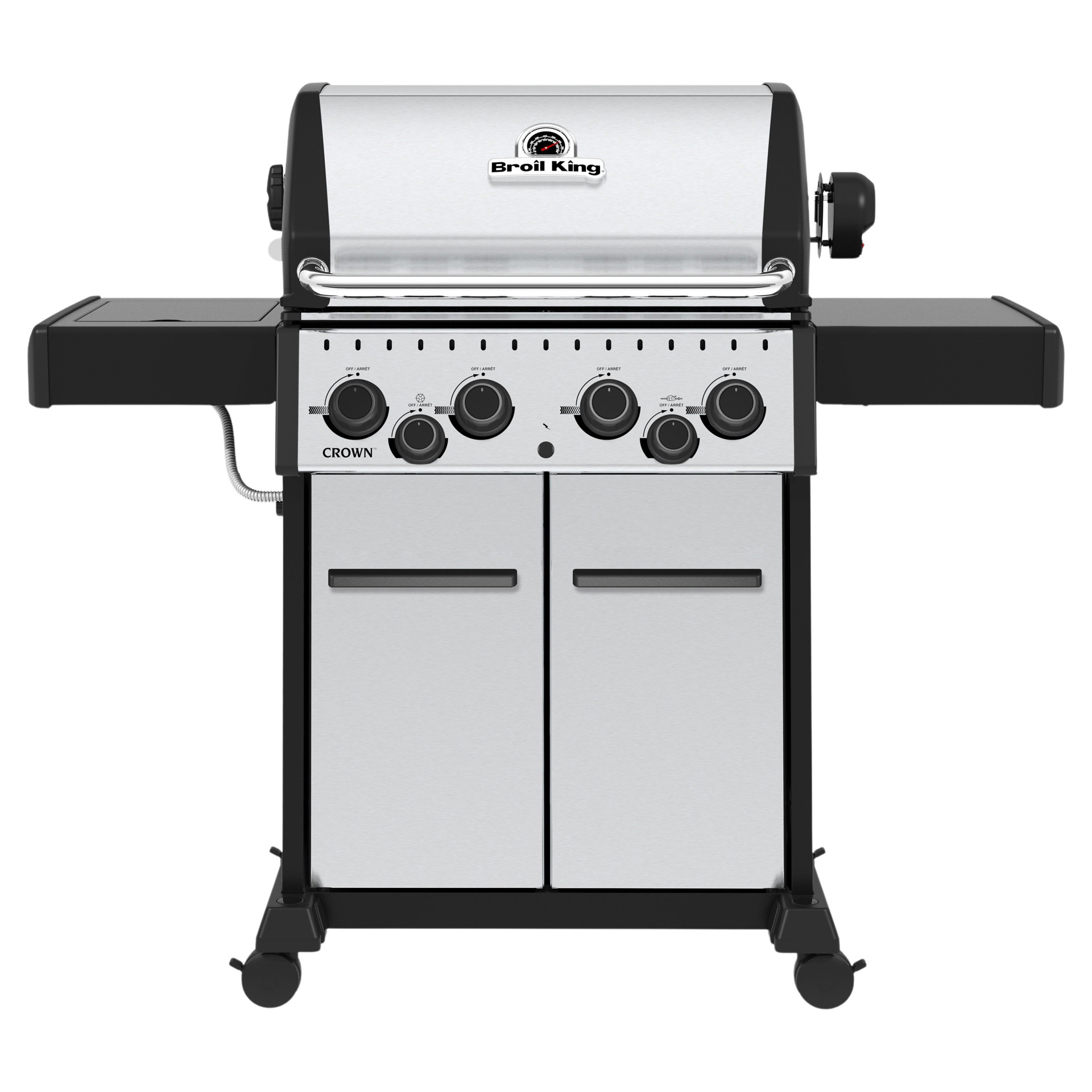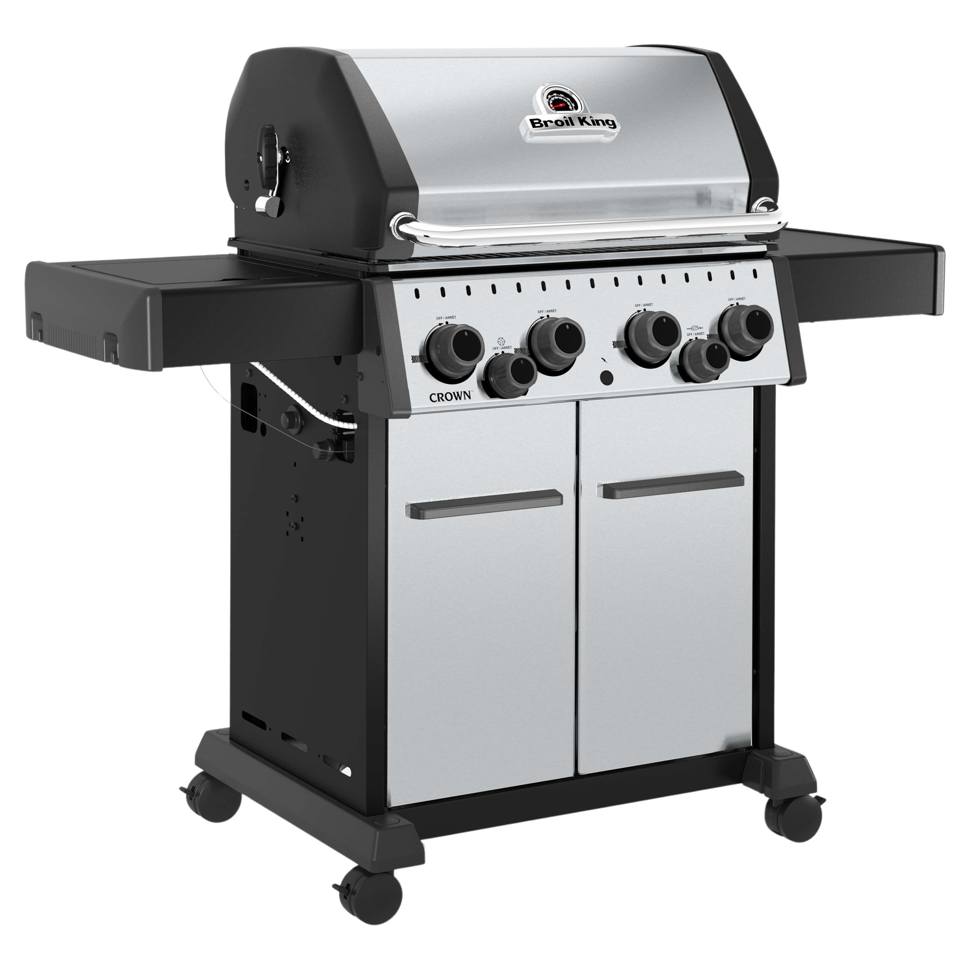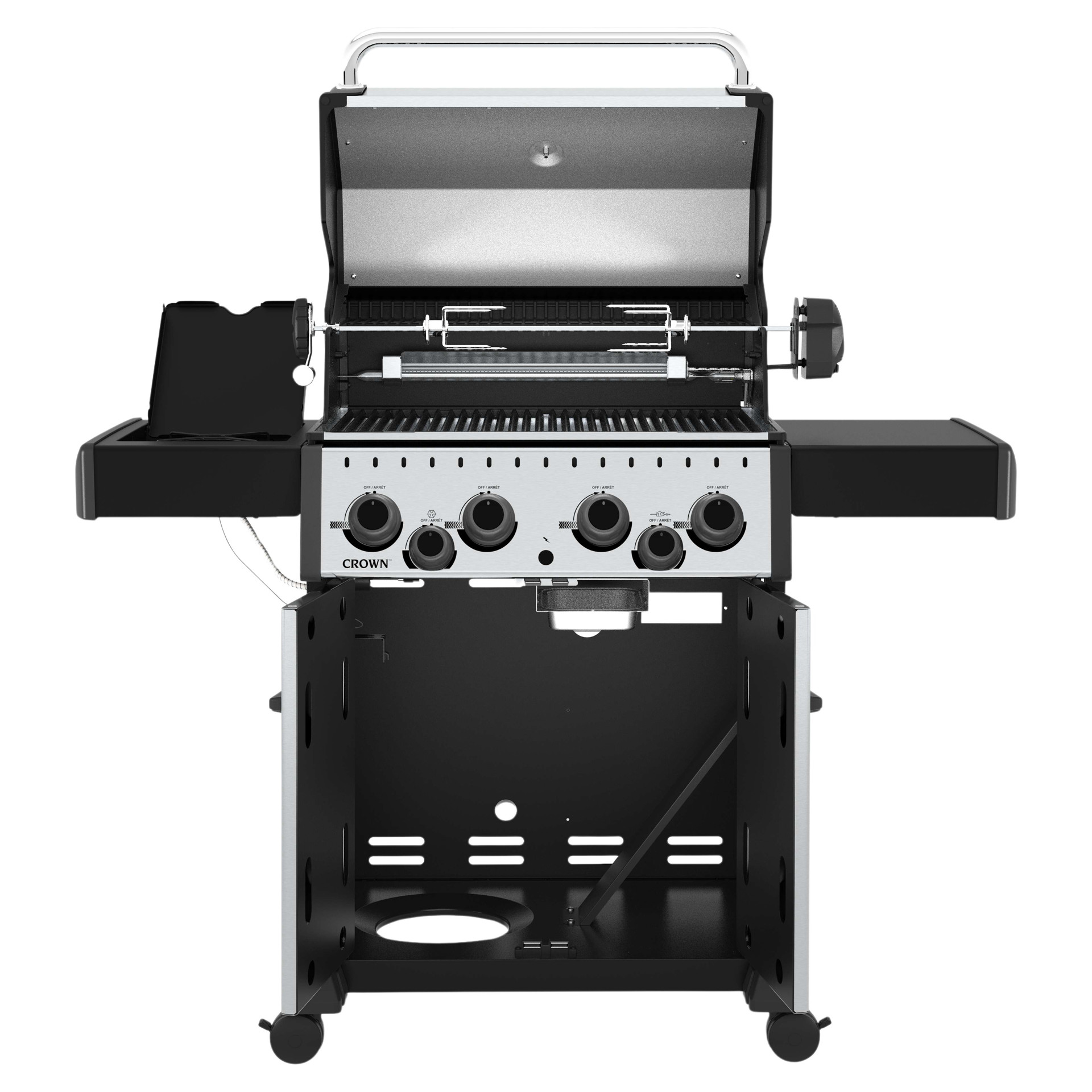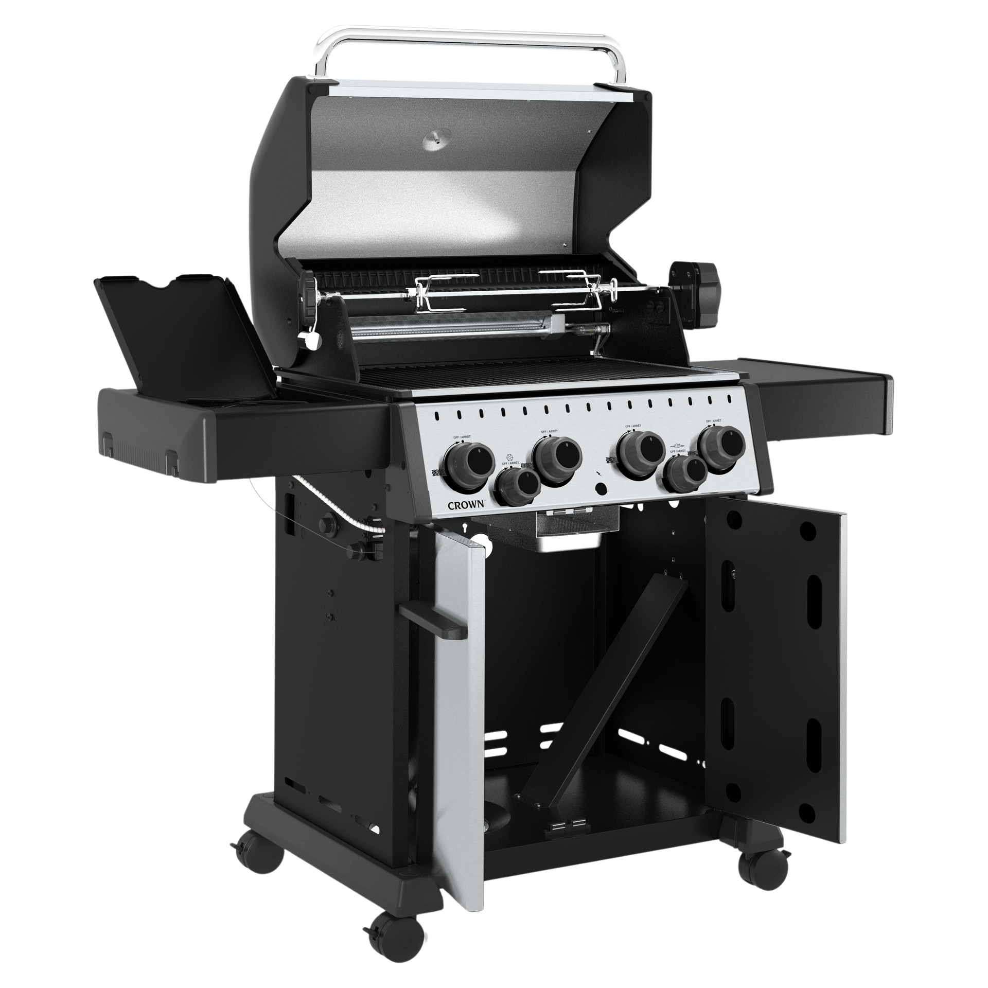 All Crown™ 400 series barbecues feature heavy-duty cast-iron cooking grates with three positions, black fold-down side shelves and a base with integrated cabinet.