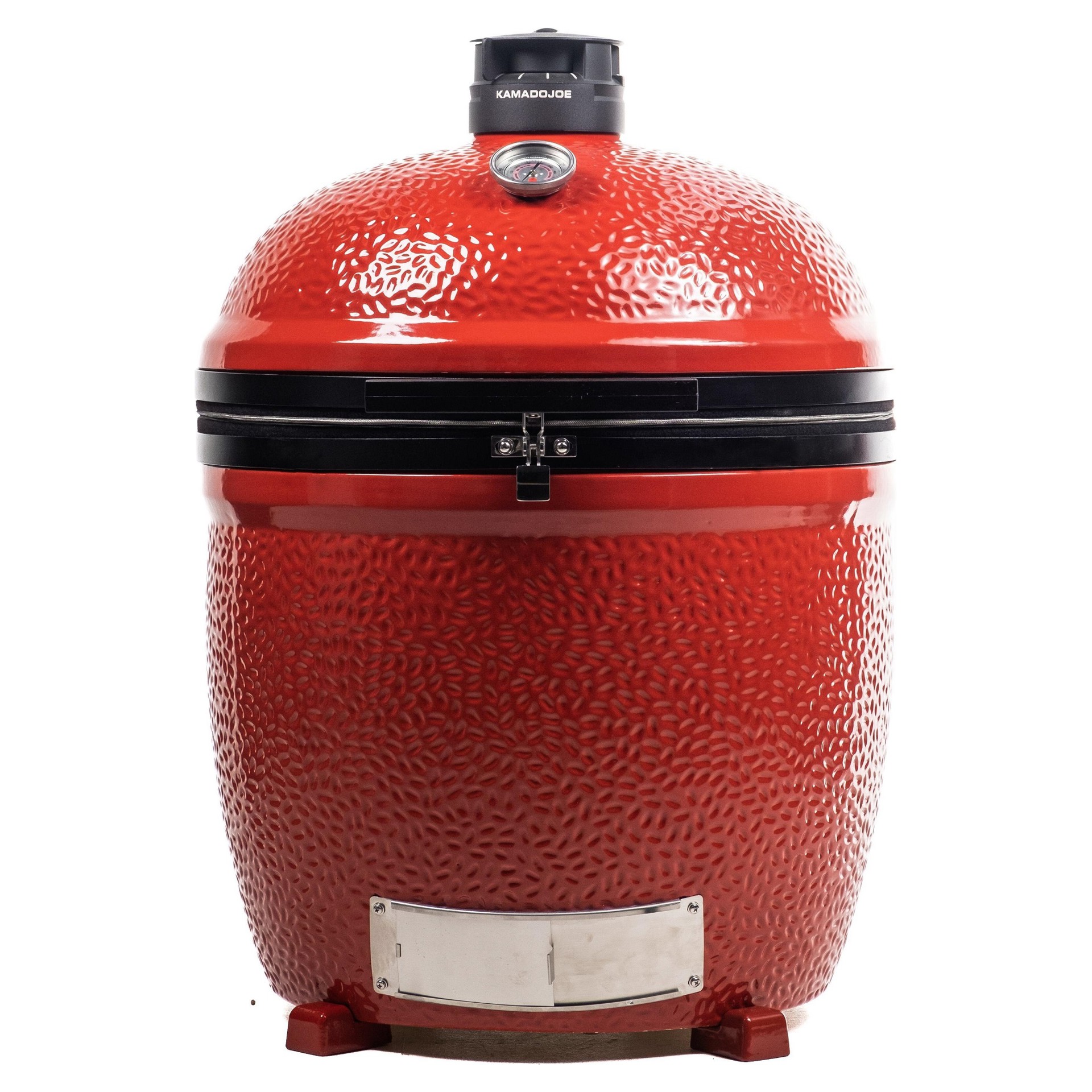 Details: KJ15040821 Kamado ceramic grill with 450 sq. in. cooking surface, SloRoller hyperbolic smoke chamber, 3-level divide-and-conquer, pneumatic lift hinge, red color.