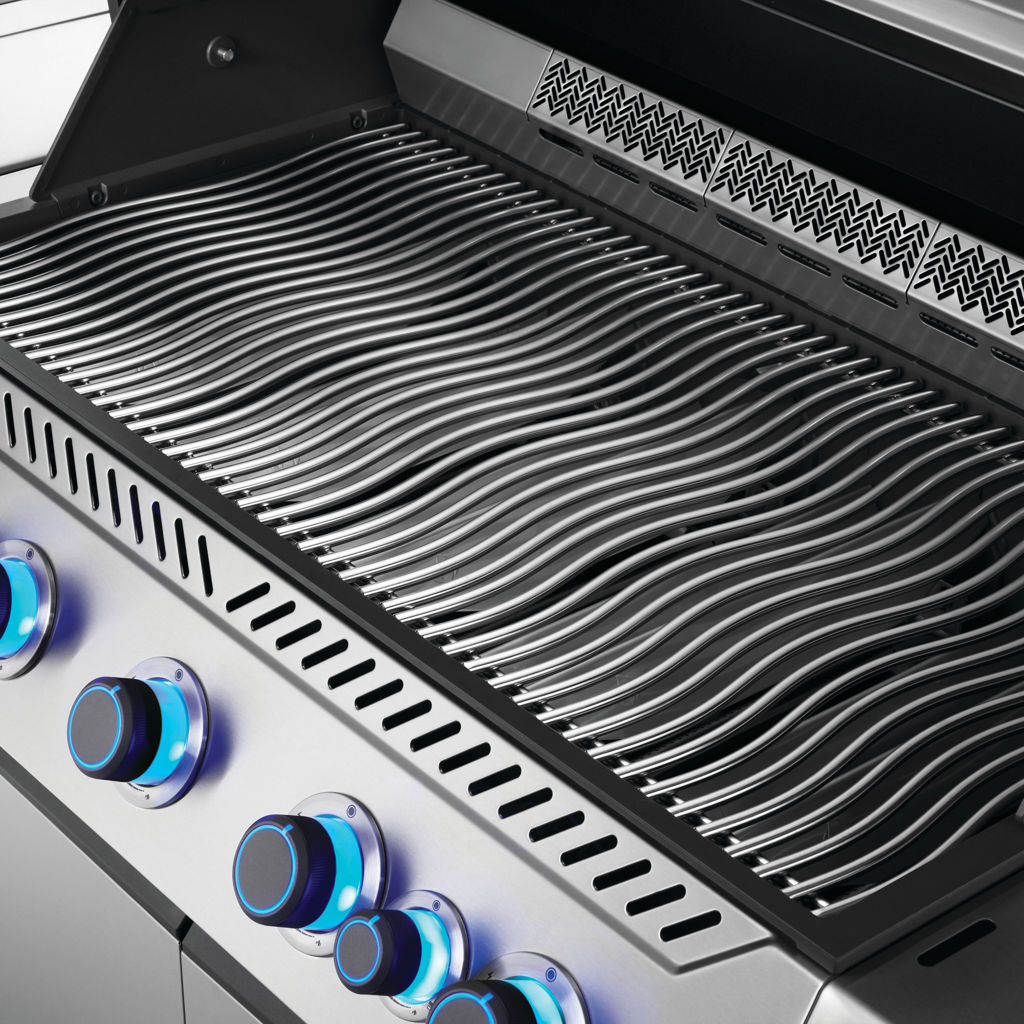 The Prestige 665 five-burner stainless steel connected gas grill with infrared side and back burner features Wi-Fi and Bluetooth connectivity.