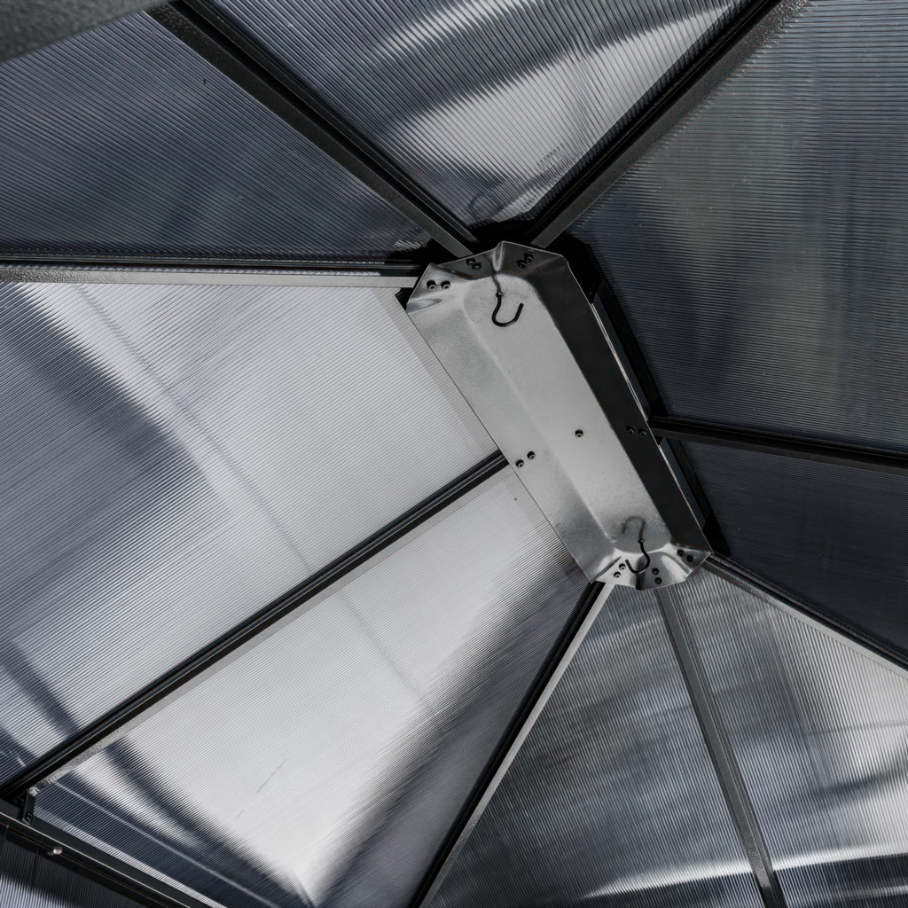 • Polycarbonate 6mm roof panels block harmful UV Rays while allowing natural light into the gazebo