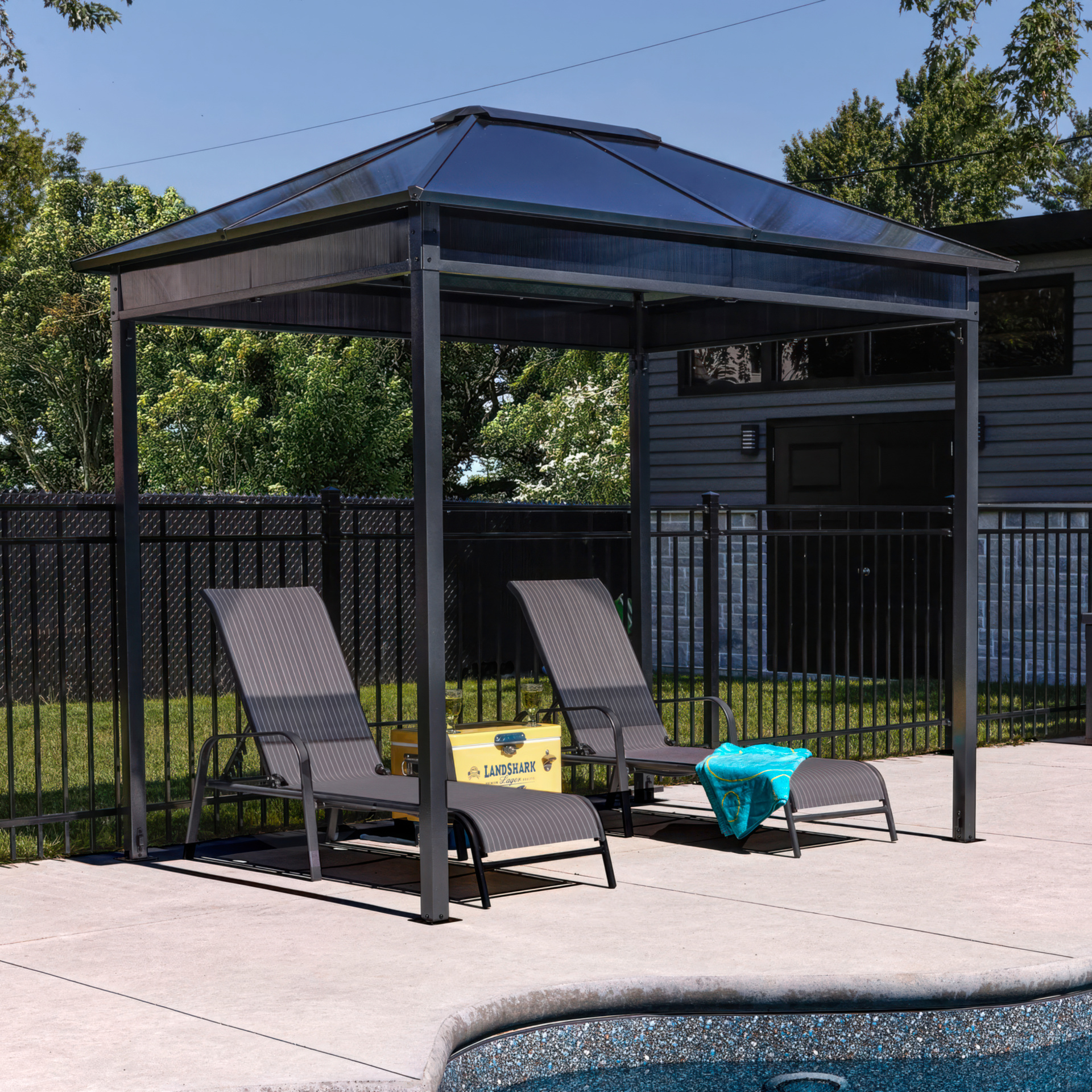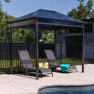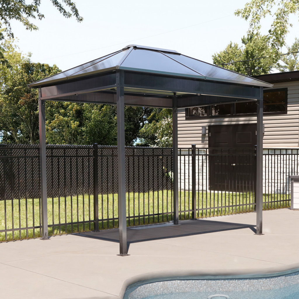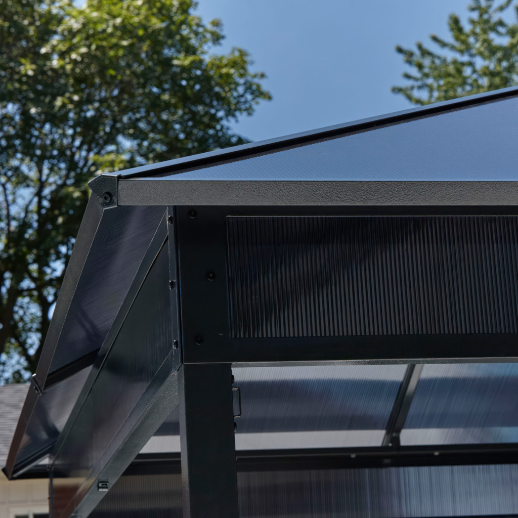 The Danxia sun shelter is a nice mix of classic and modern design. It matches any home and backyard. A polycarbonate roof allows sunlight inside the gazebo while blocking harmful ultraviolet rays.