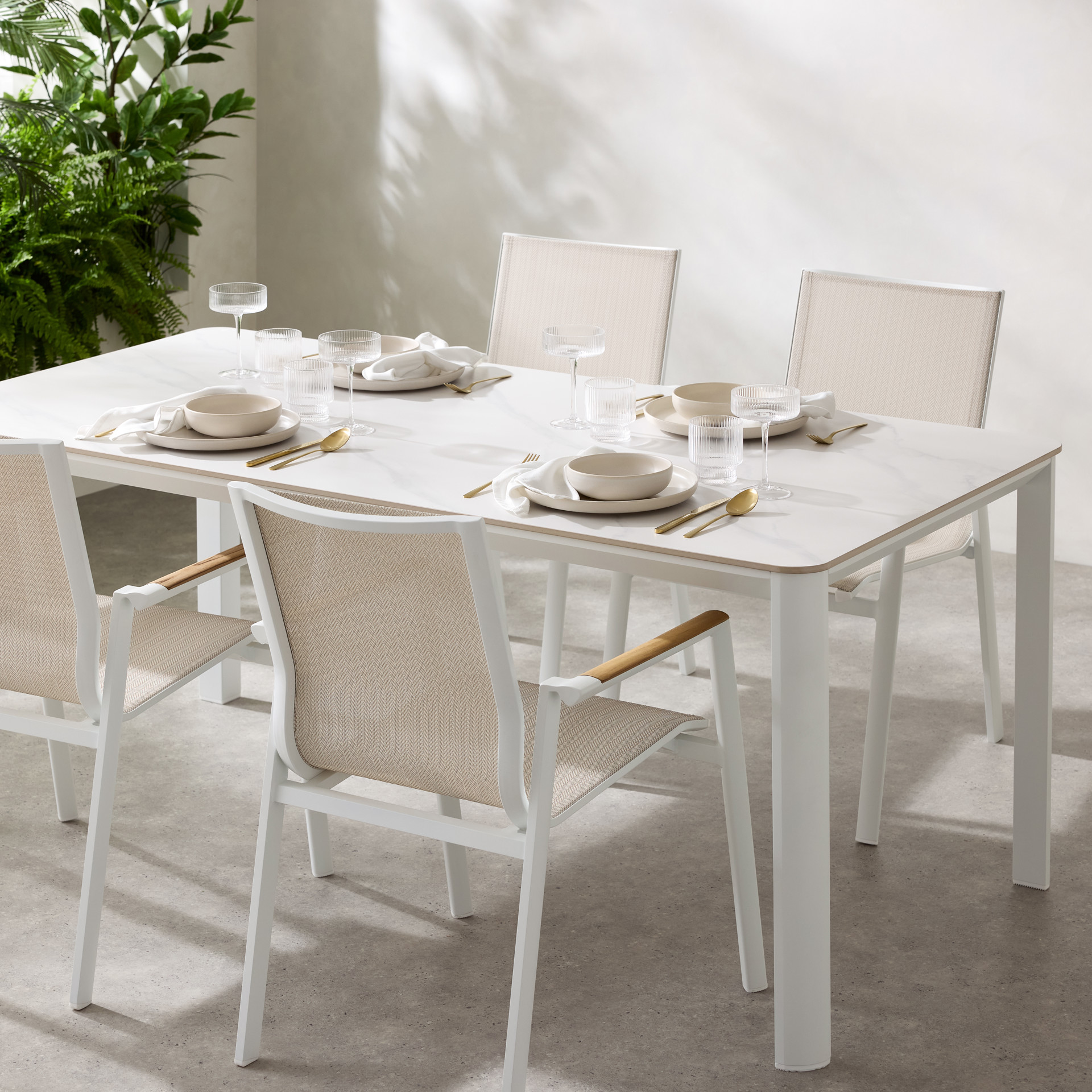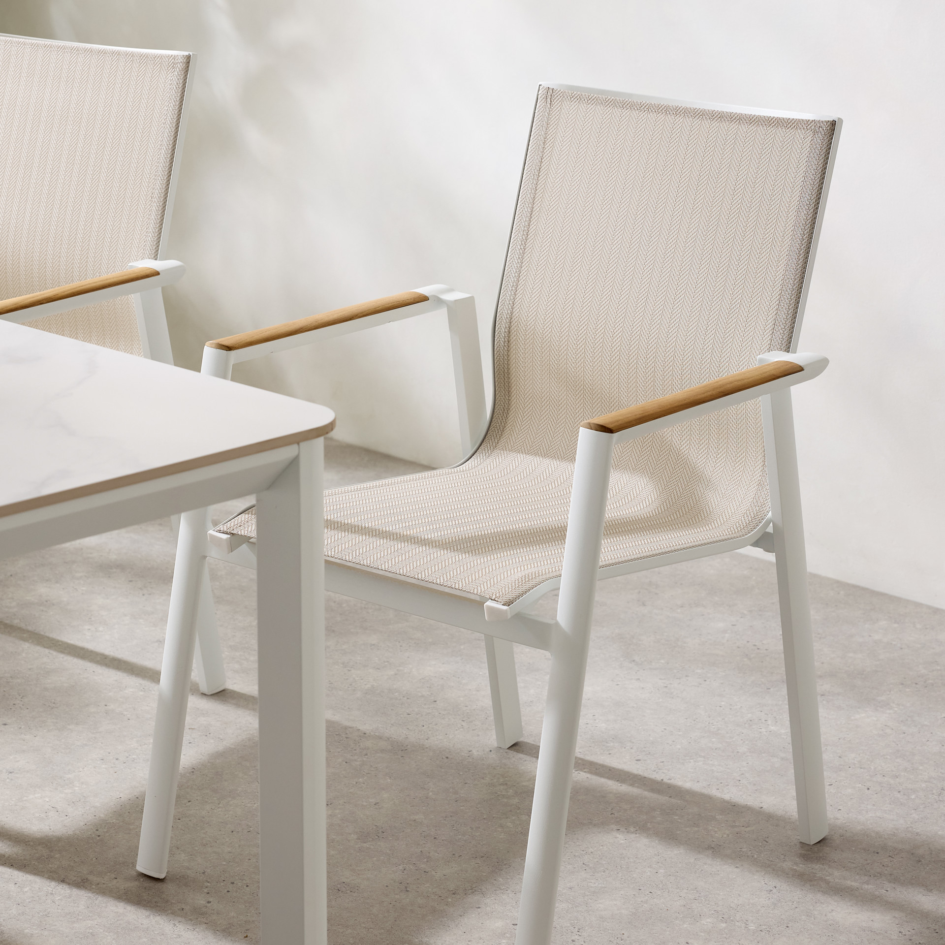 Combining lightweight design with lasting durability, this outdoor chair in textilene with an aluminum frame is crafted to deliver optimal comfort throughout the warm season. Its clean silhouette, enhanced by armrests with warm-toned accents, blends effortlessly into any outdoor setting,  whether on a terrace, balcony, or around a garden table.