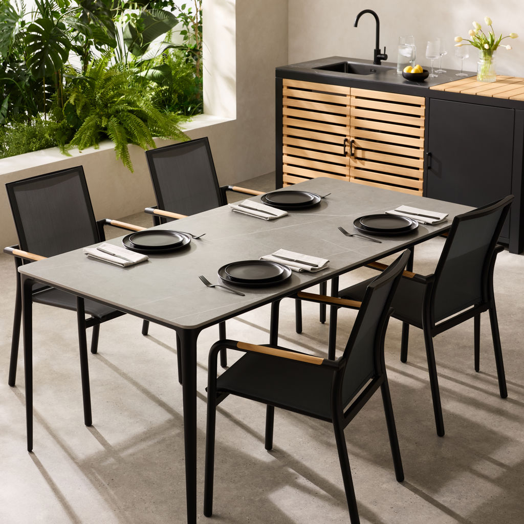 With its sintered stone top and aluminum frame, it is sure to impress your guests.
