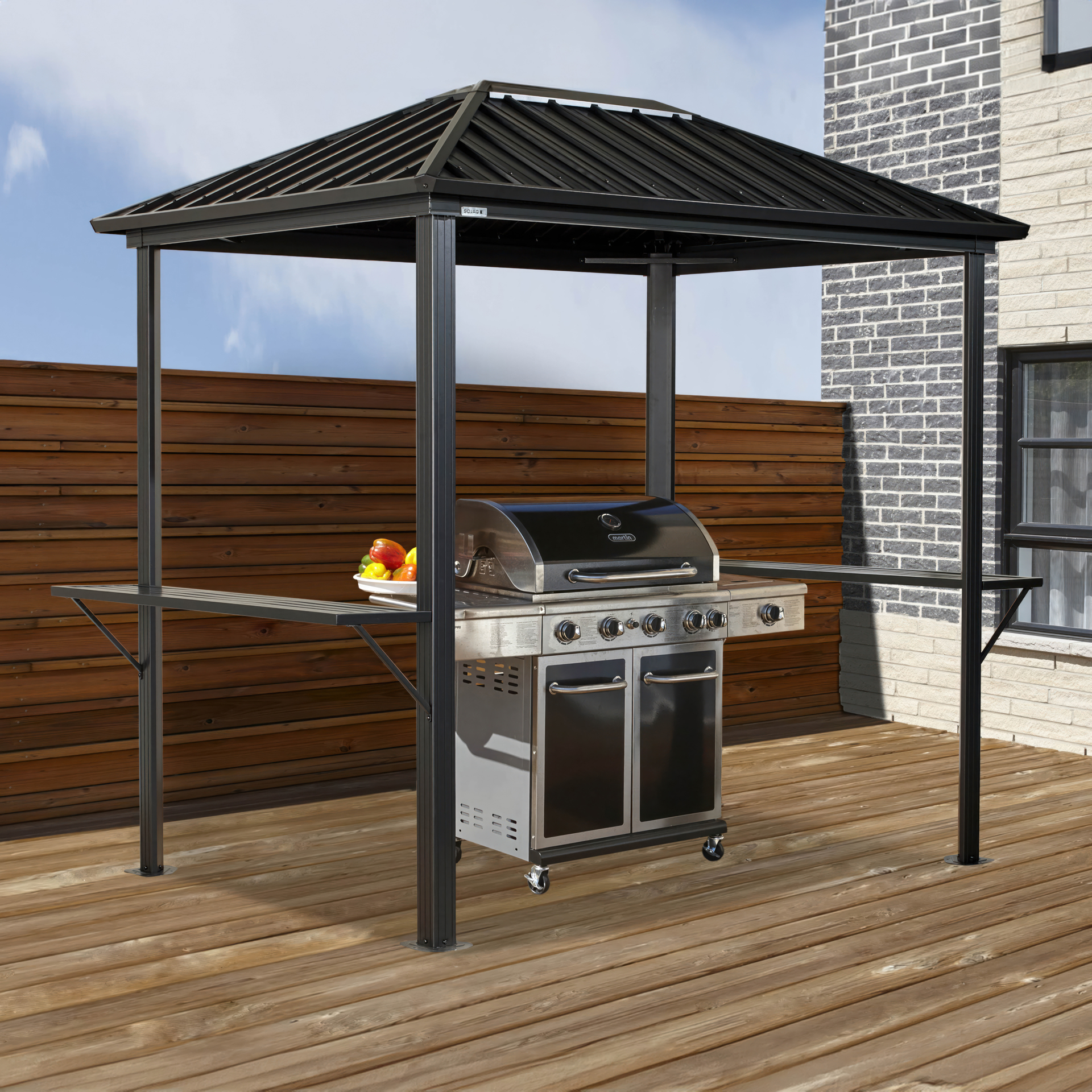 The Dakota Grill Shelter protects your barbecue from the elements with its galvanized steel roof.