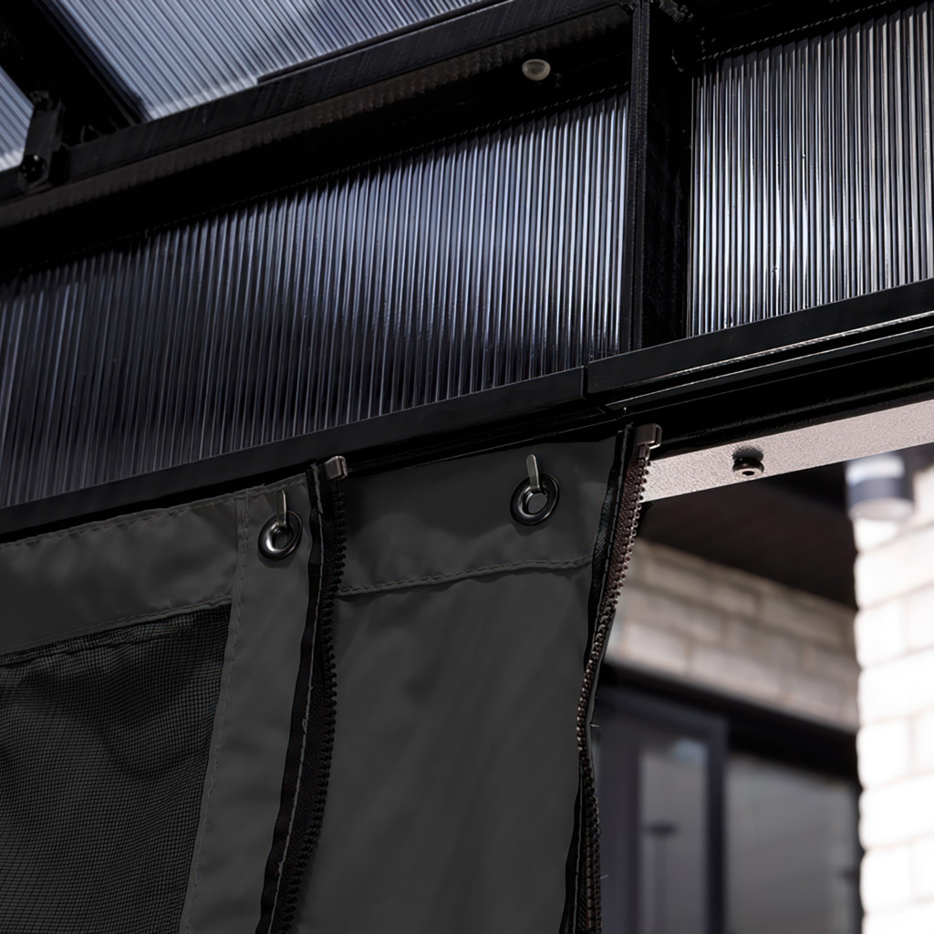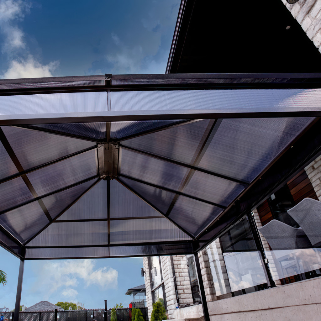 • Polycarbonate 6mm roof panels block harmful UV Rays while allowing natural light into the gazebo