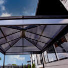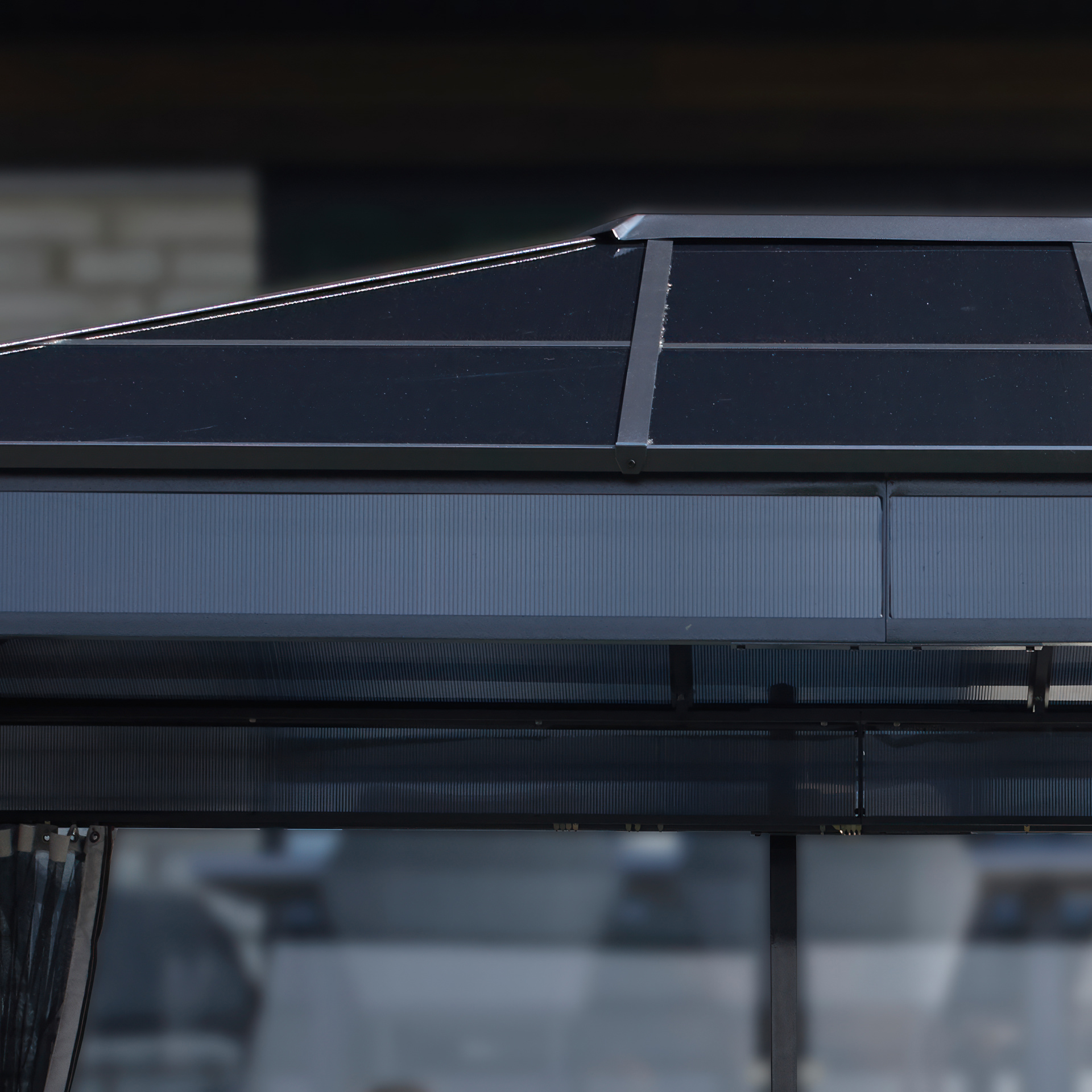 A polycarbonate roof allows sunlight inside the gazebo while blocking harmful ultraviolet rays.