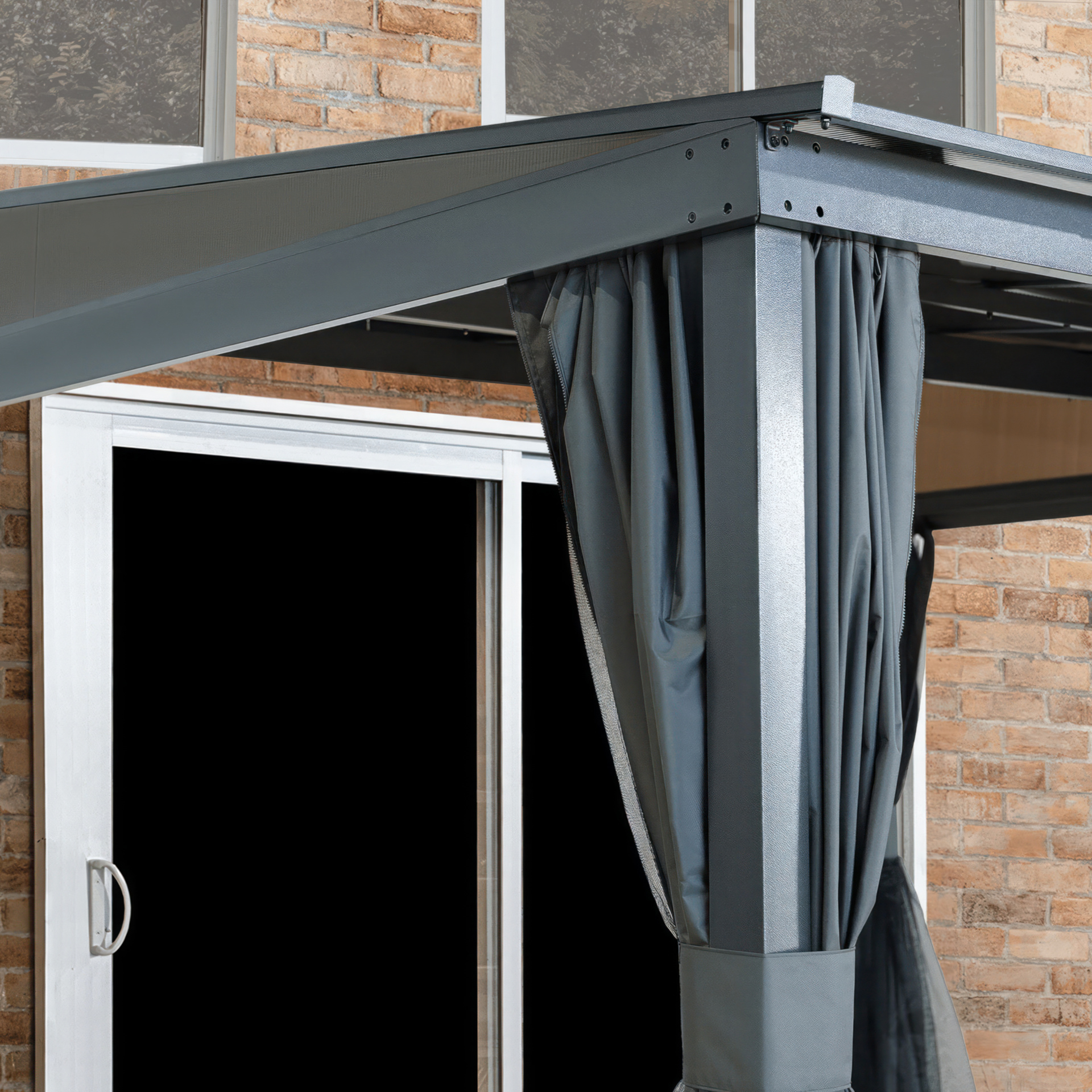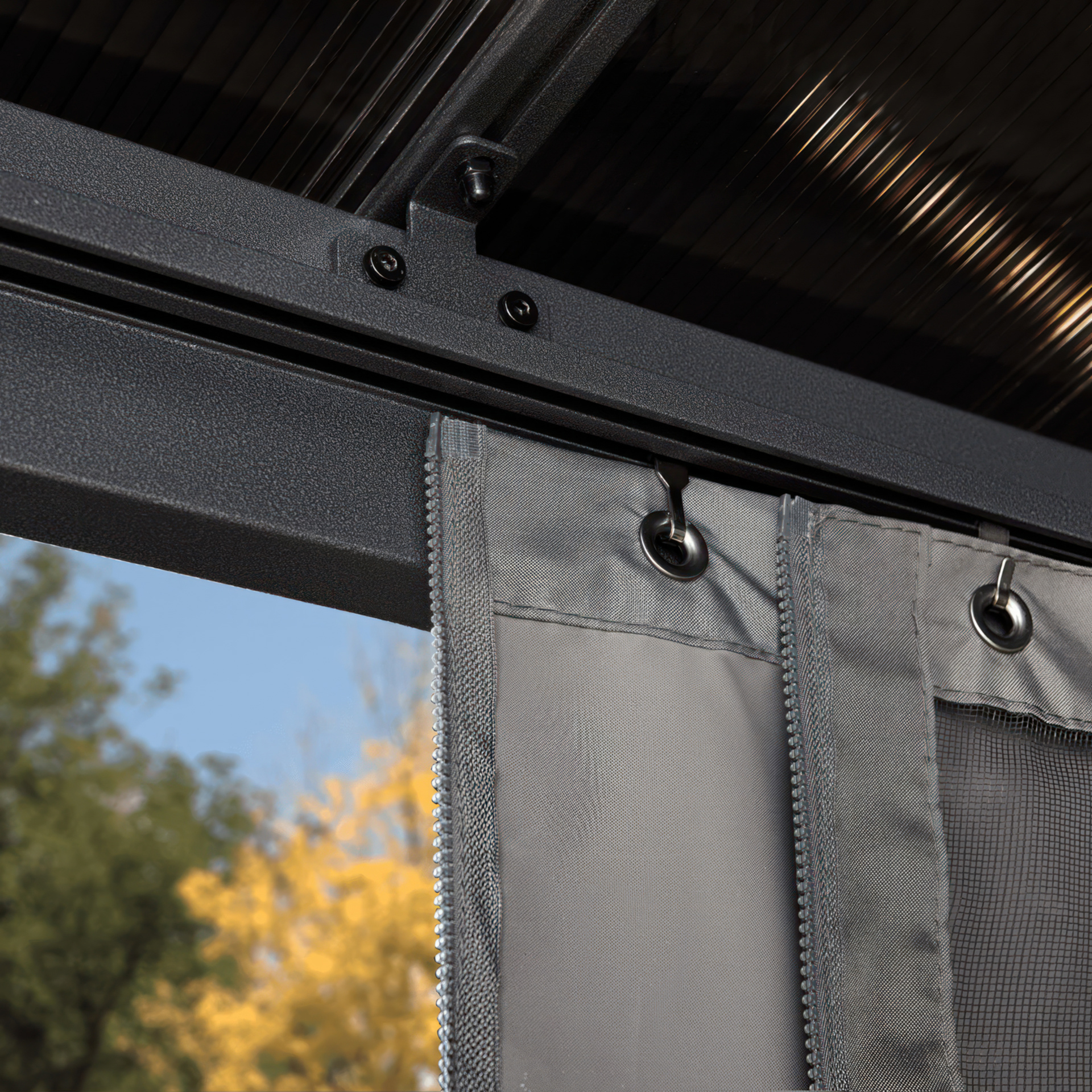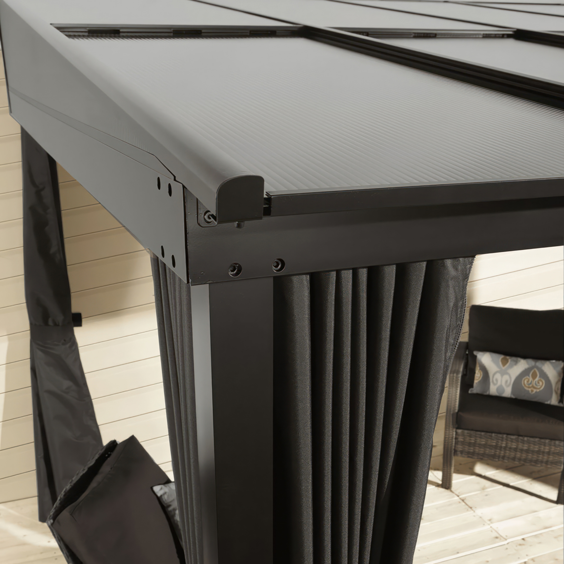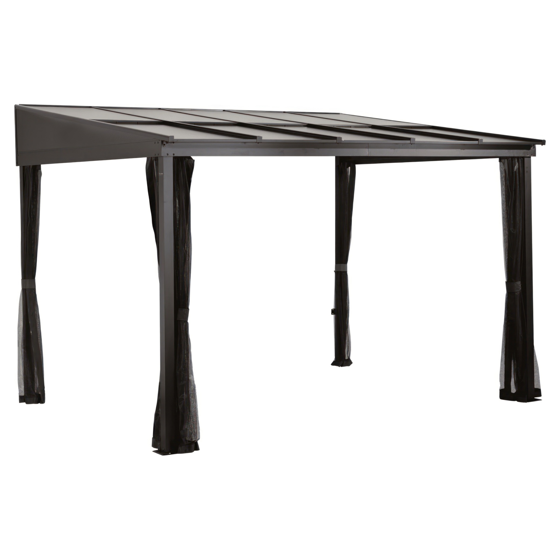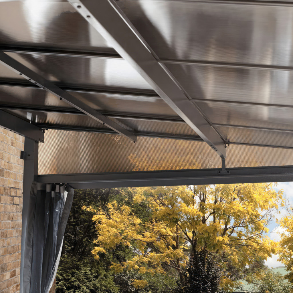 The durable aluminum frame and polycarbonate roof panels can be left outside in any season.