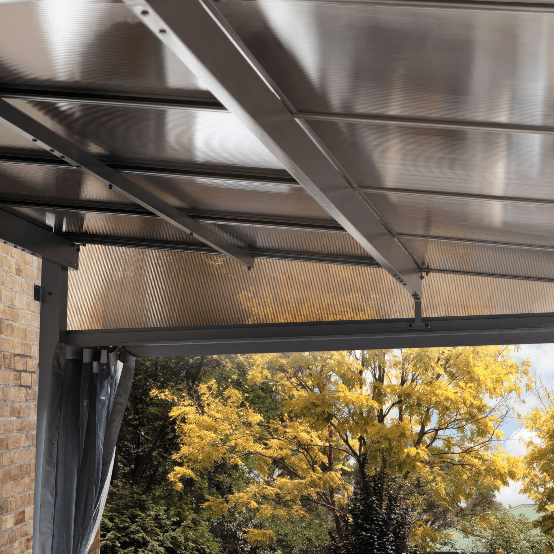 The durable aluminum frame and polycarbonate roof panels can be left outside in any season.