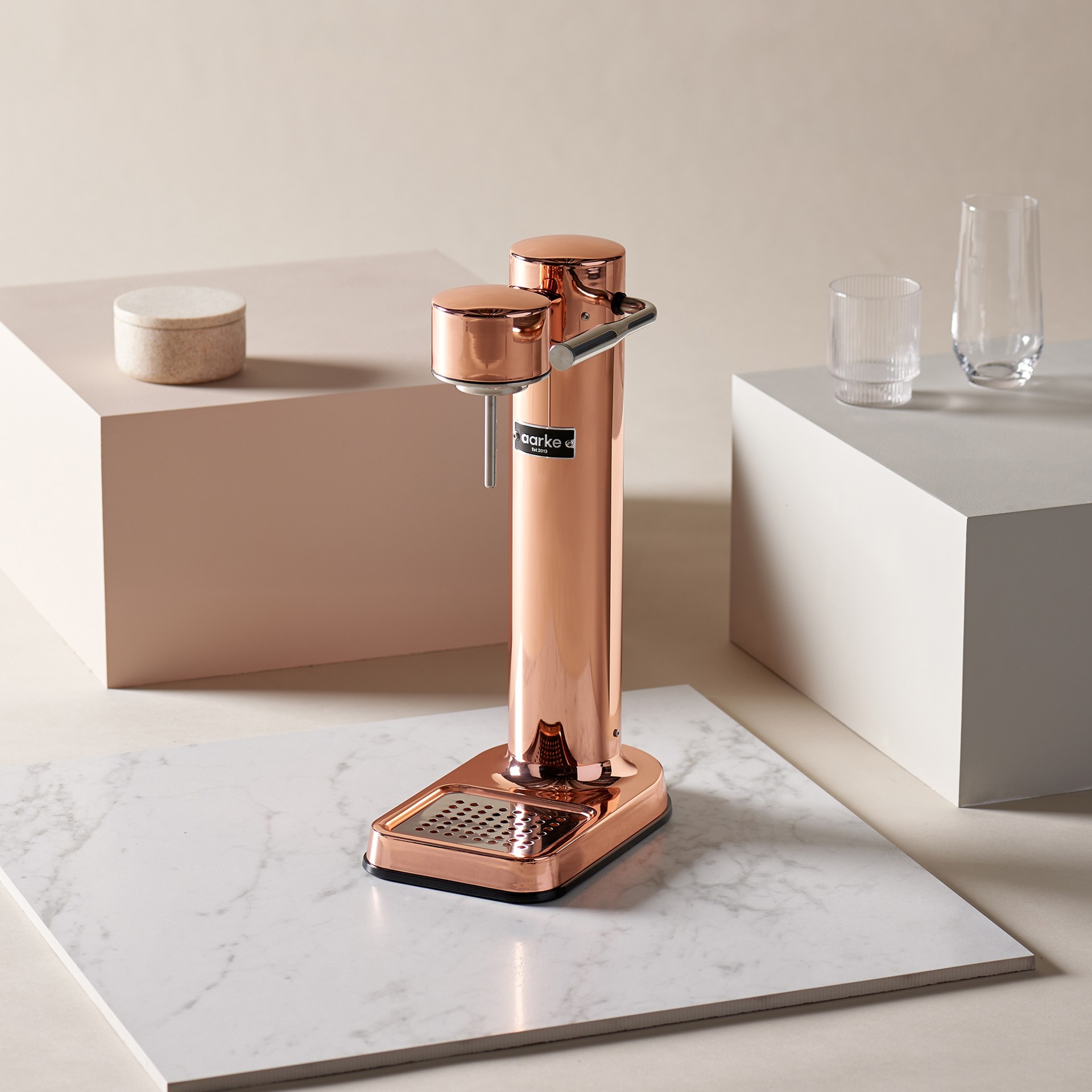 Making sparkling water at home has never been more elegant. The Aarke Carbonator is designed to be the world's slimmest and most compact sparkling water machine. The machine is compatible with CO2 bottles from all major brands.