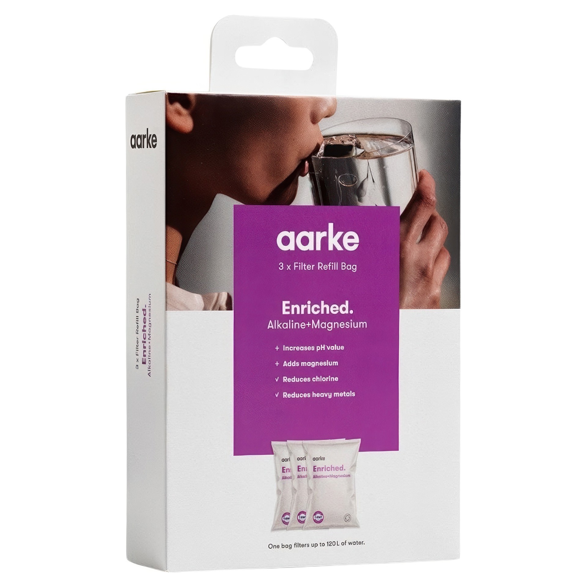 Enriched filter granules are our mineral-enhanced filter option. In addition to making your water cleaner and tastier by reducing chlorine and heavy metals, they also add magnesium mineral and transform your tap water into alkaline water thanks to an increased pH value. Made exclusively for Aarke Purifier technology, the granules in the bag are poured into the purifier's refillable water filter cartridge.