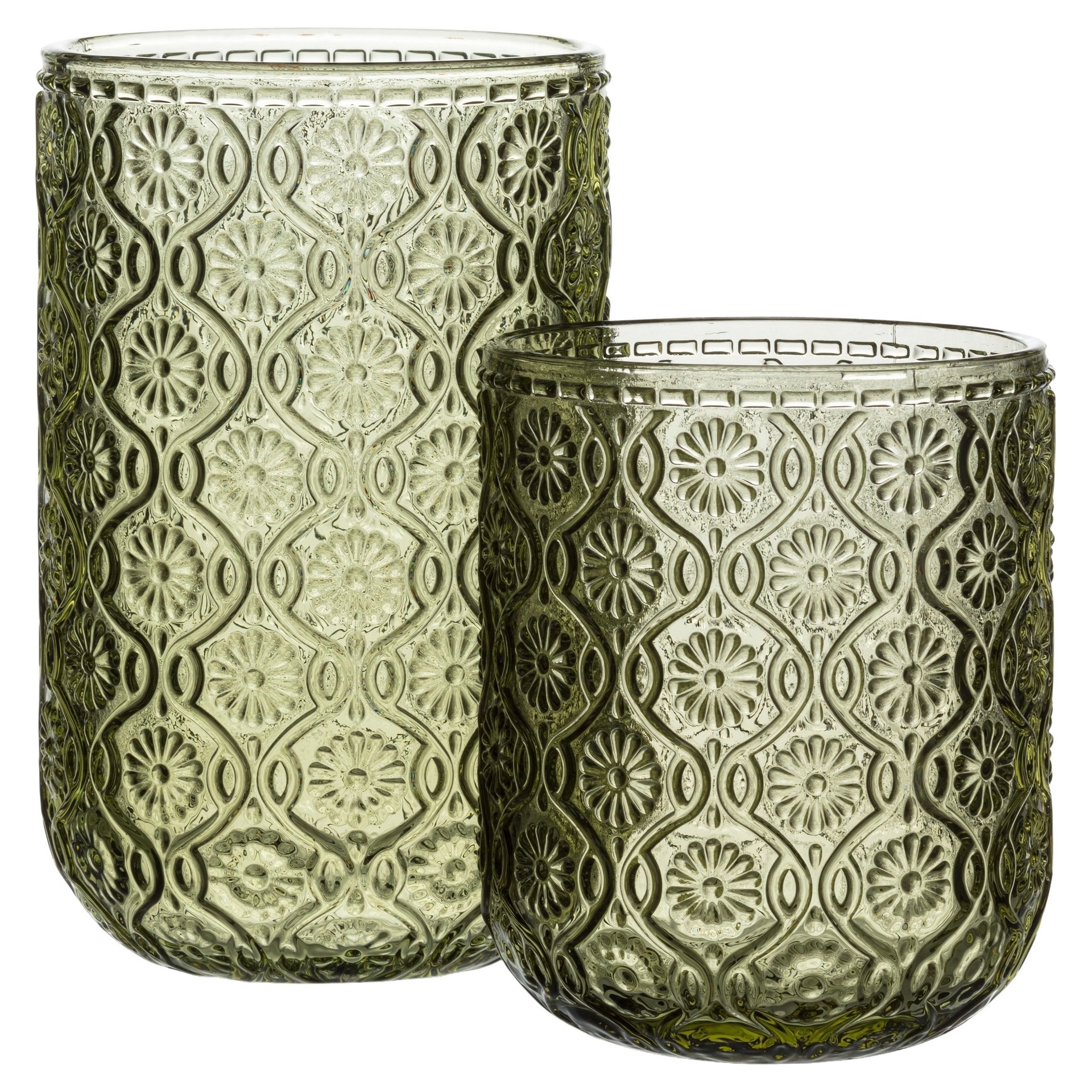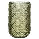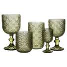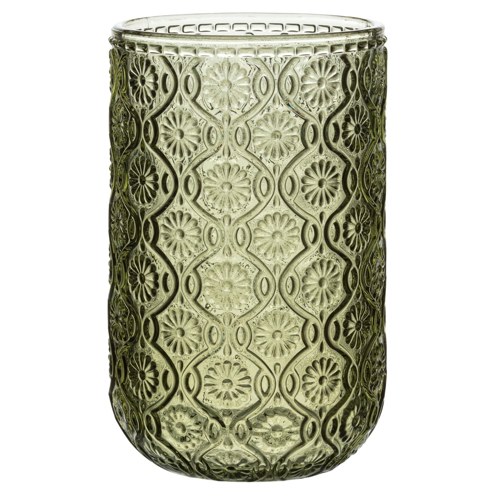 Adorned with a delicate embossed floral pattern in a rich olive hue, this glass brings a touch of beauty and character to your table.