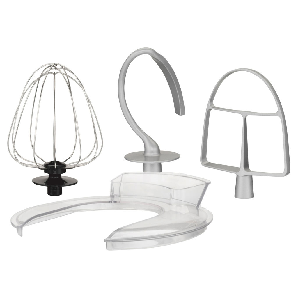 - Includes bowl, whisk, dough hook, flat beater, and splash guard