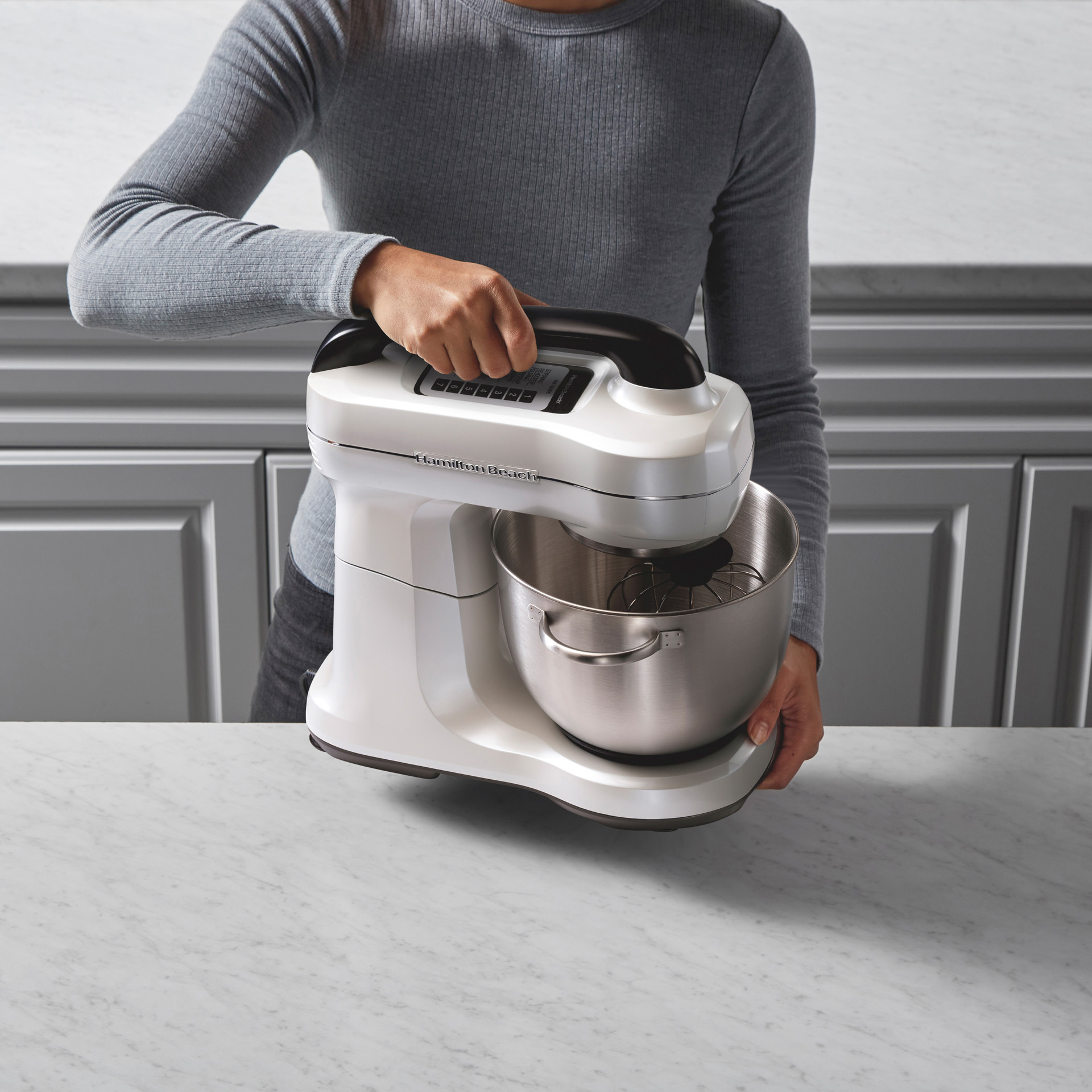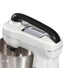 The integrated top handle provides a secure grip for lifting the head to add ingredients or change attachments and makes moving and storing the mixer effortless.