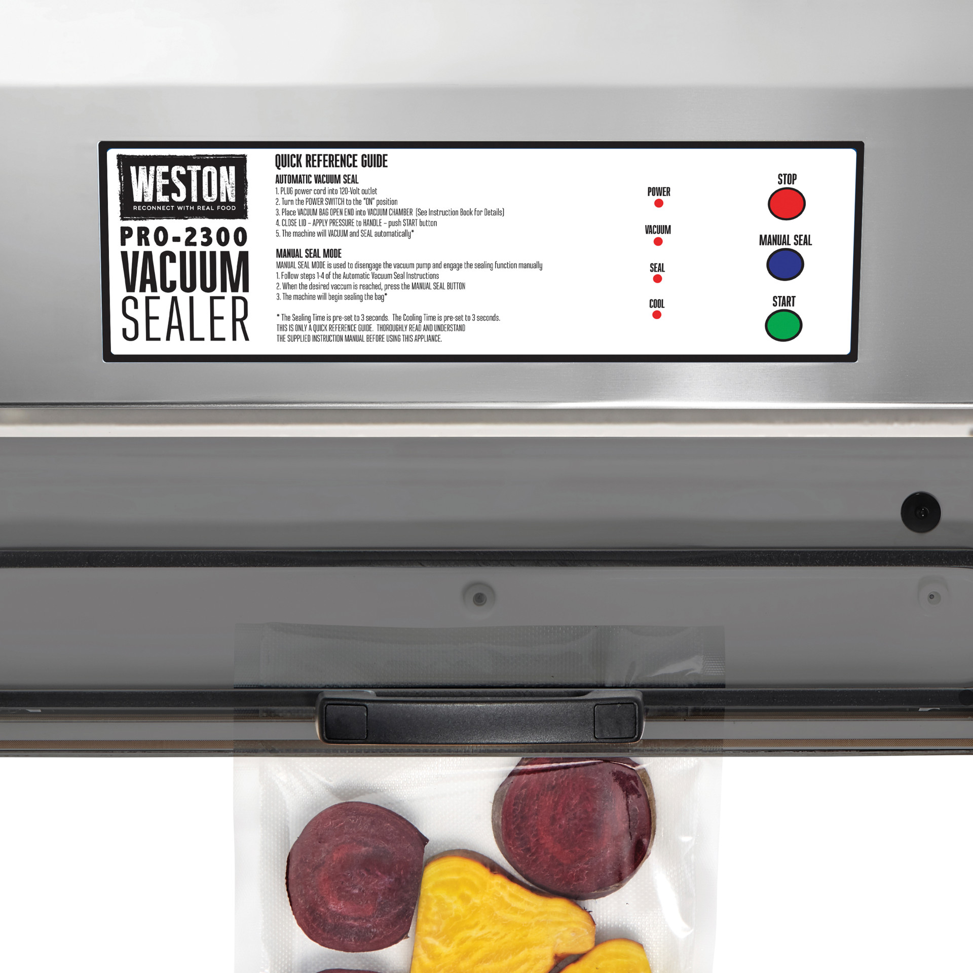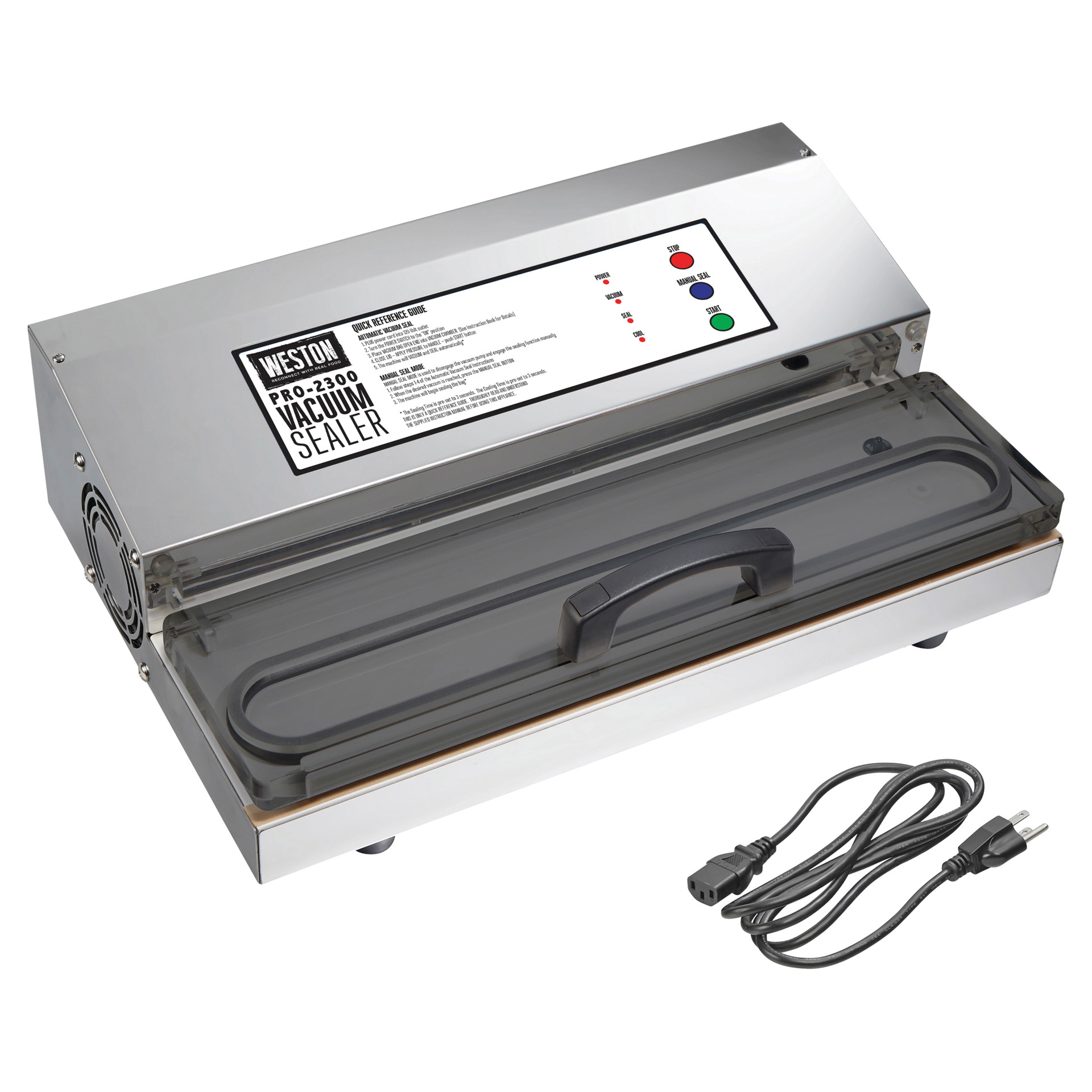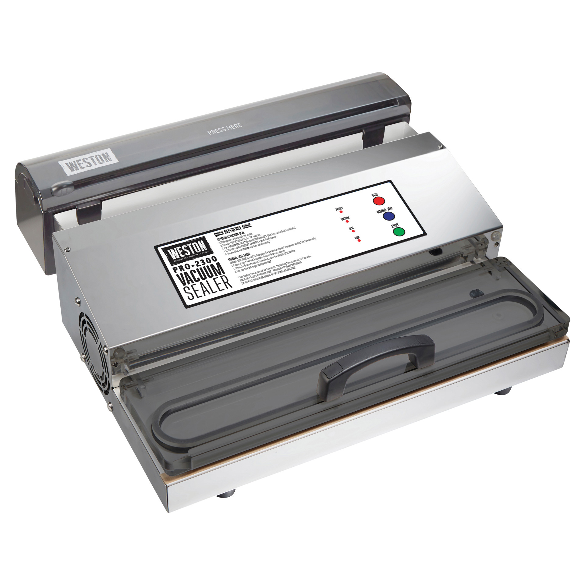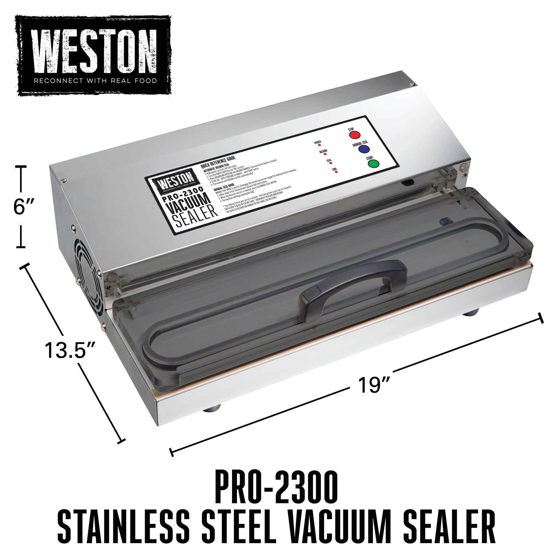 The Weston® Pro-2300 stainless steel vacuum sealer keeps game, fish, fruits and vegetables, bulk foods, and leftovers fresher for longer than traditional storage methods. It features a powerful, long-lasting motor and an extra-long, extra-wide sealing bar.