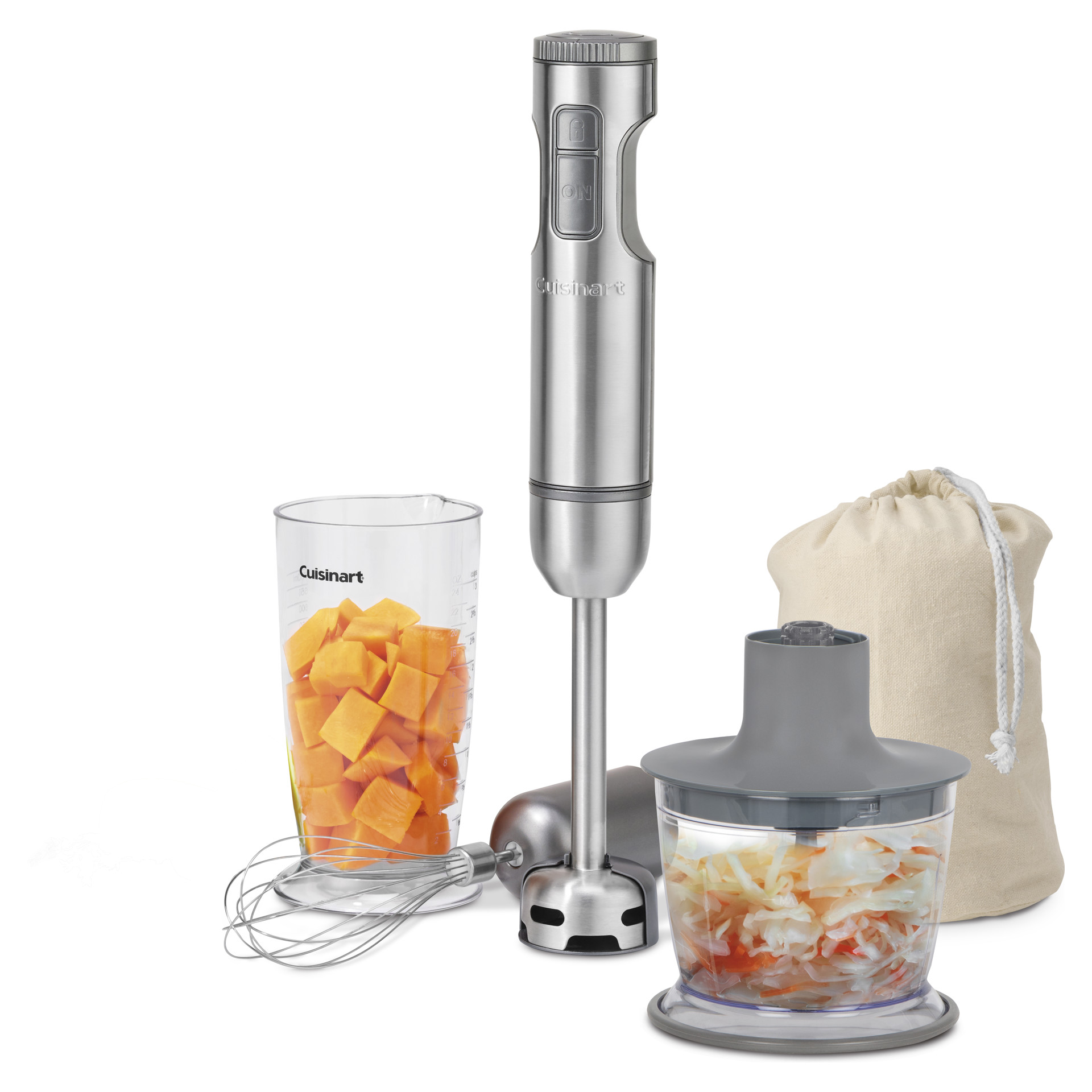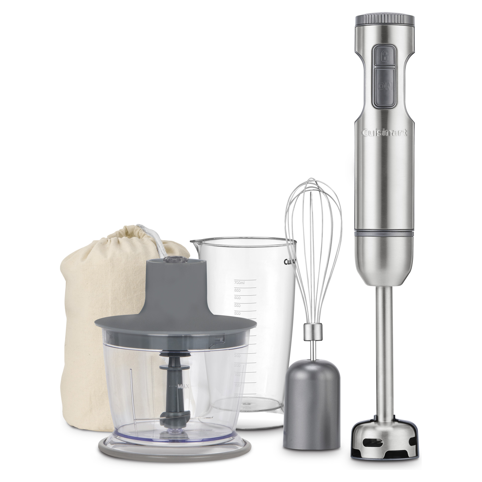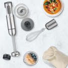 The elegant brushed stainless steel Smart Stick variable speed hand blender includes a variety of multi-functional attachments. The chopper attachment performs multiple prep tasks such as chopping nuts, grinding hard cheeses, and whipping creamy toppings in seconds!