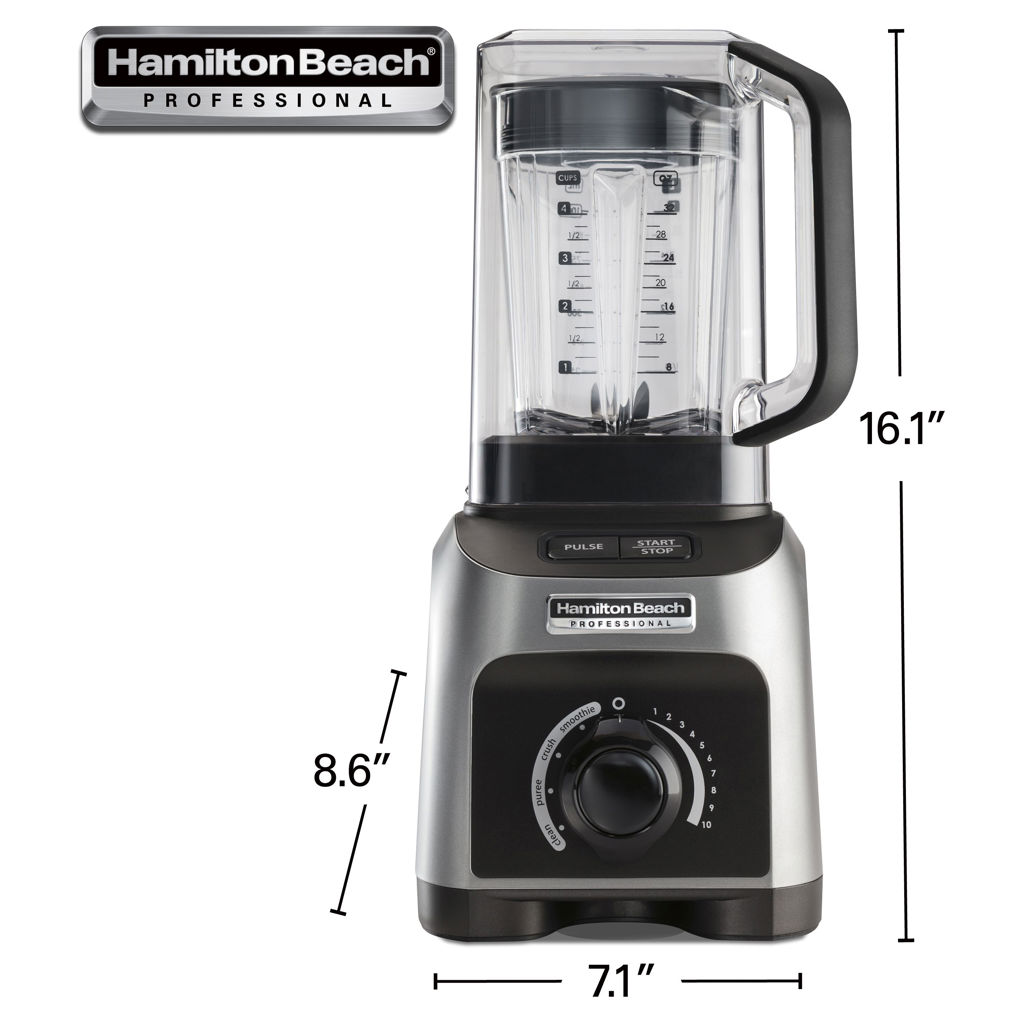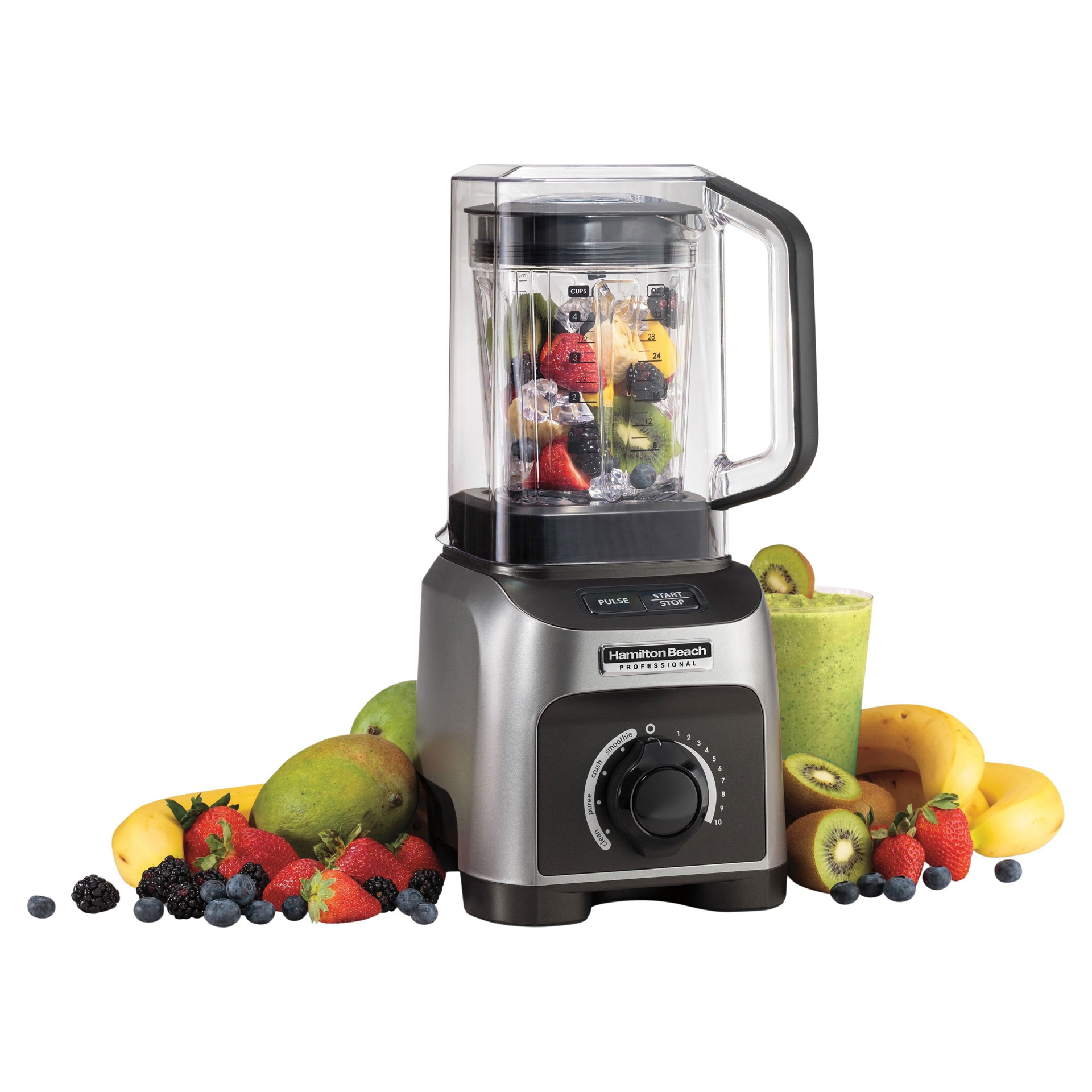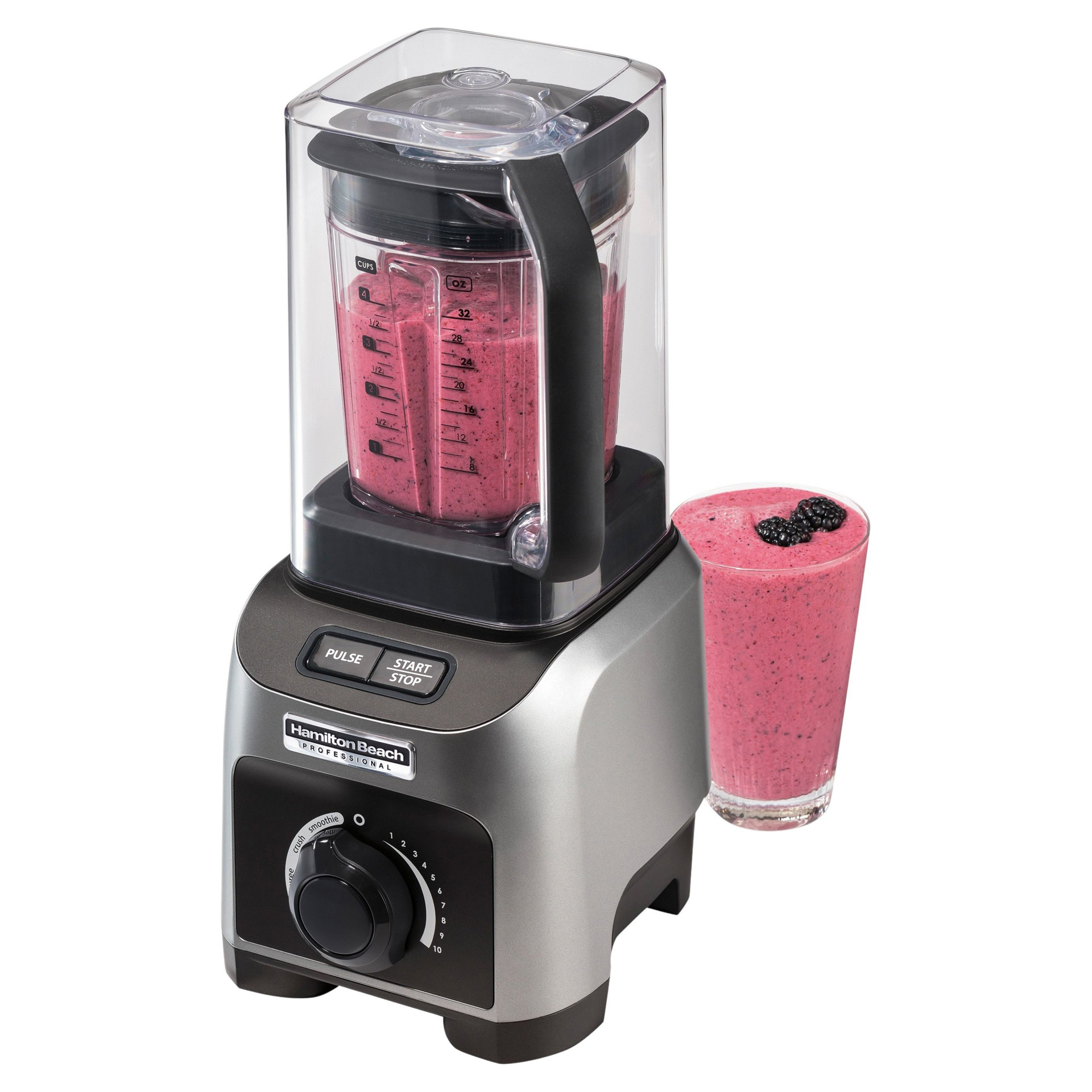 Boost the power of your recipes while reducing noise with the Hamilton Beach Professional Quiet Blender. Its peak 2-horsepower motor drives stainless-steel blades at over 170 km/h, crushing ice, frozen fruit, and other tough ingredients in seconds. Built with vibration-dampening components, optimized airflow, and a removable quiet shield, this blender is designed for quieter operation and the shield can even double as a pitcher.