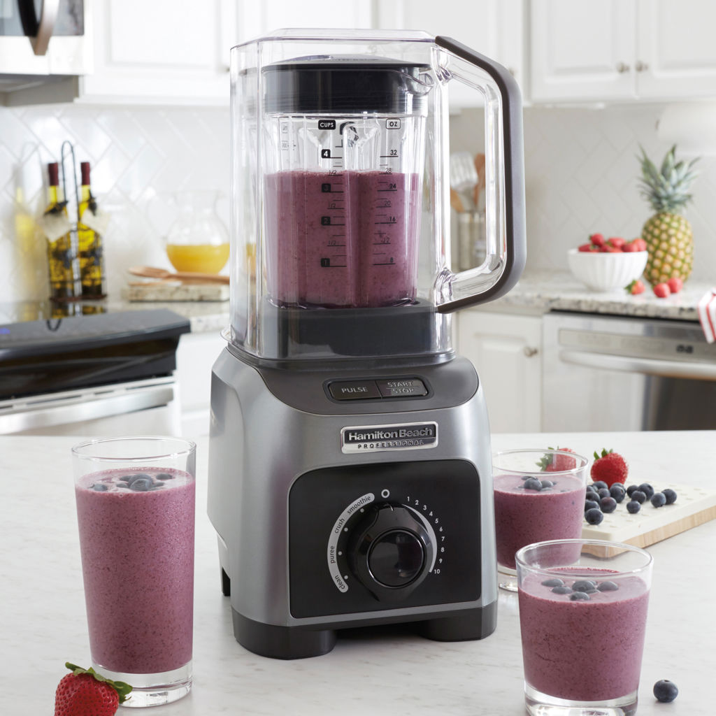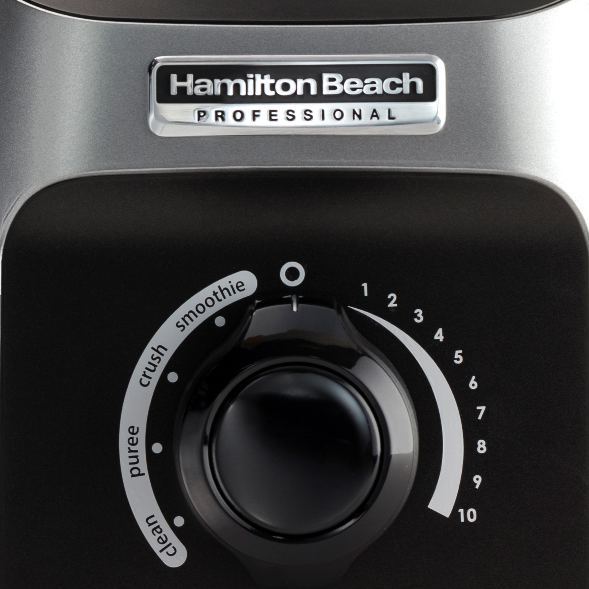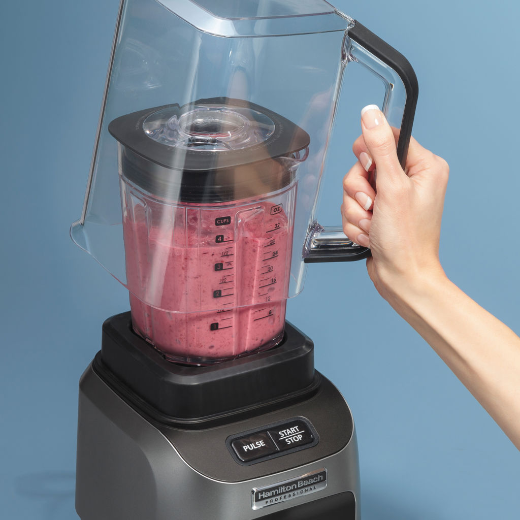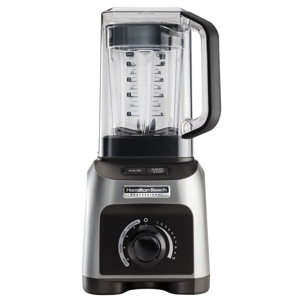 Boost the power of your recipes while reducing noise with the Hamilton Beach Professional Quiet Blender. Its peak 2-horsepower motor drives stainless-steel blades at over 170 km/h, crushing ice, frozen fruit, and other tough ingredients in seconds. Built with vibration-dampening components, optimized airflow, and a removable quiet shield, this blender is designed for quieter operation and the shield can even double as a pitcher.