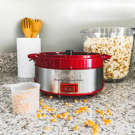 • Motorized stirring arm ensures that just one tablespoon of oil evenly coats all kernels. Enjoy popcorn with less fat.