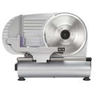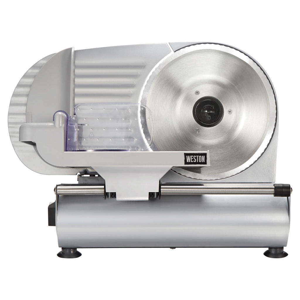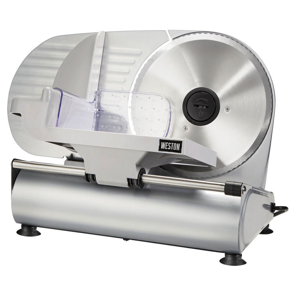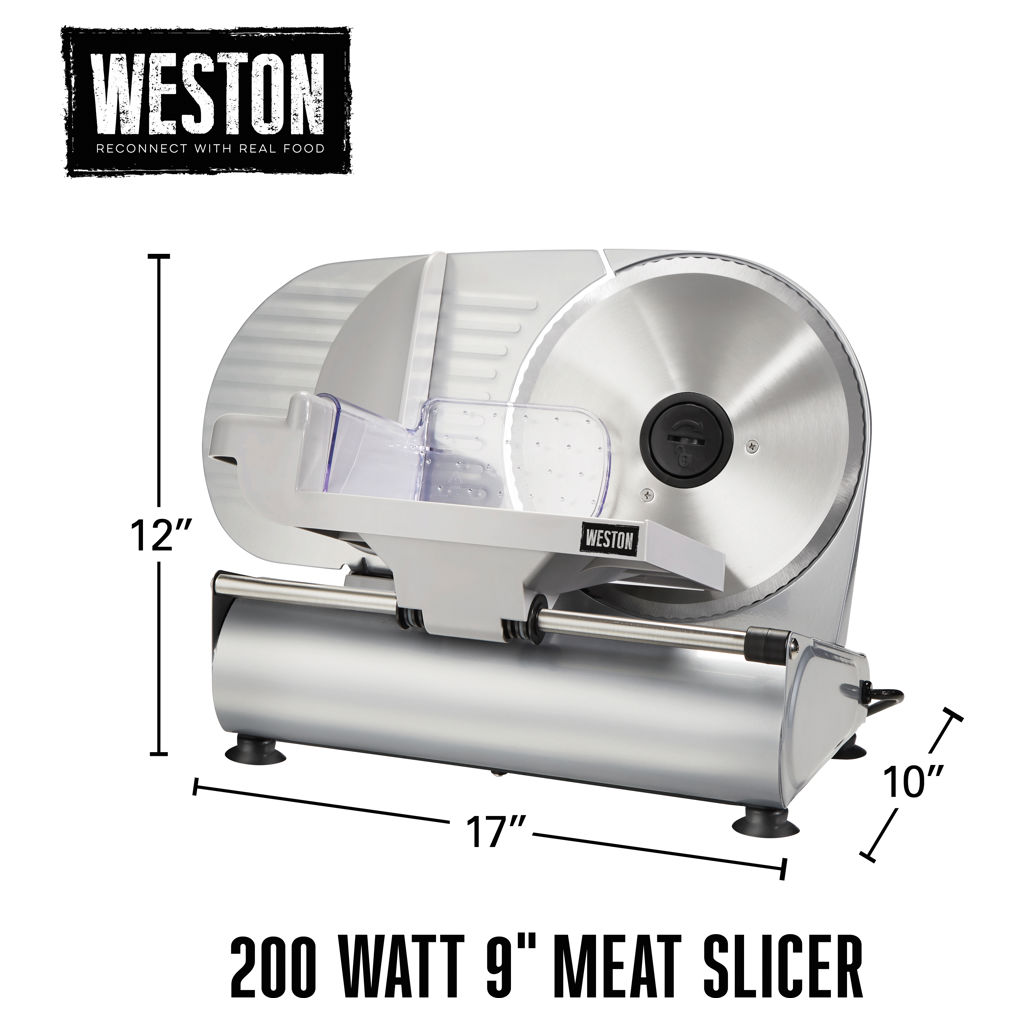 The Weston® 9-inch (23 cm) Meat Slicer quickly and evenly slices meat, cheese, bread, lettuce, tomatoes, fruit, and more. It features a powerful 200-watt motor, a 9-inch serrated stainless steel blade, adjustable slice thickness, and a large food pusher with teeth.