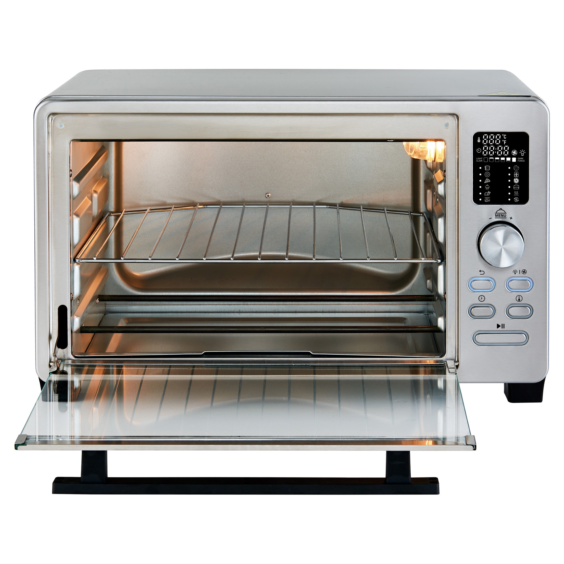 From baking to roasting and air frying, this toaster oven offers temperature control ranging from 120°F to 450°F (50-230°C) and seven functional presets including bake, broil, roast, bagel, cookies, warm, pizza, and preheat.