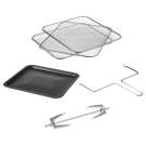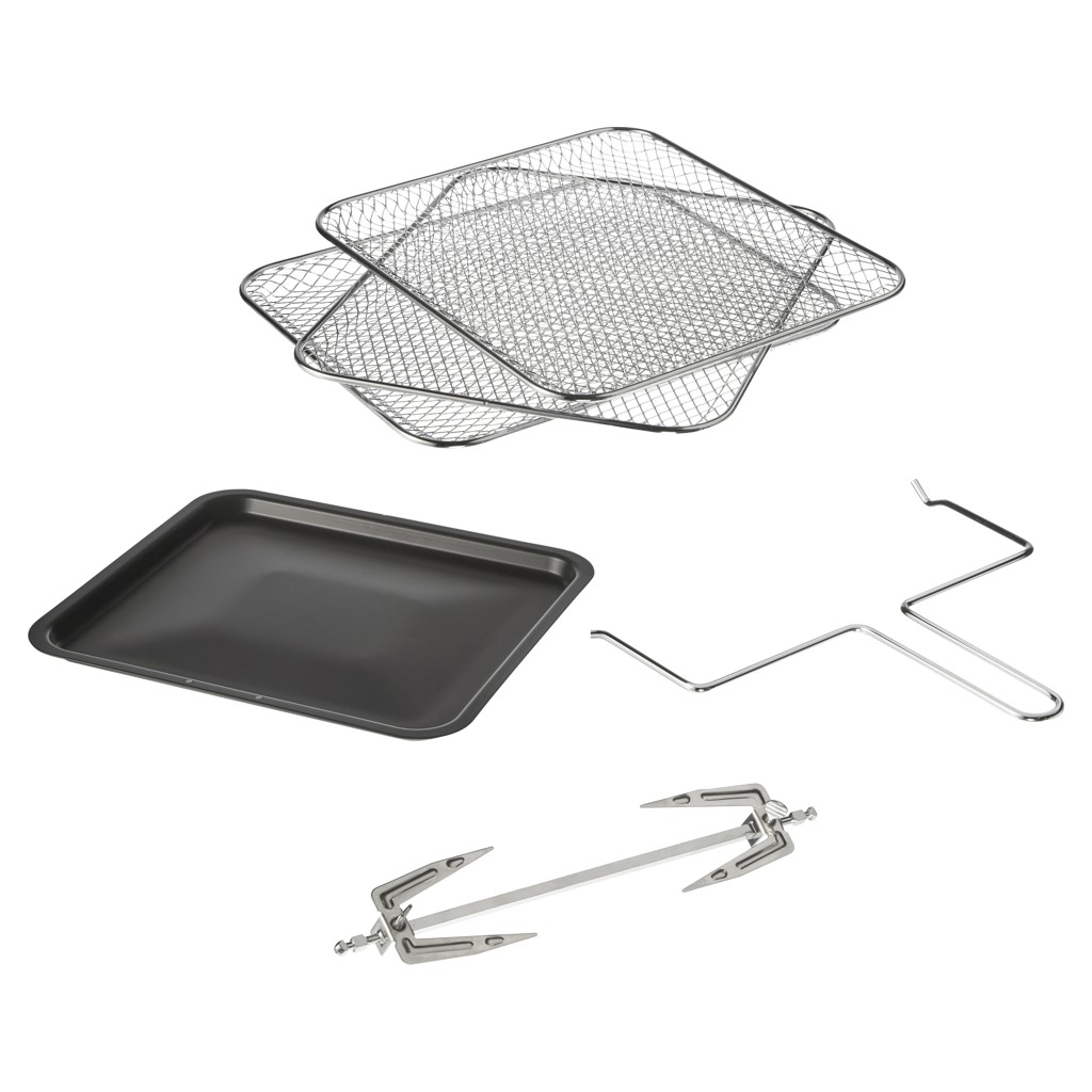 Includes 3 mesh shelves, crumb tray, rotisserie lift and accessories