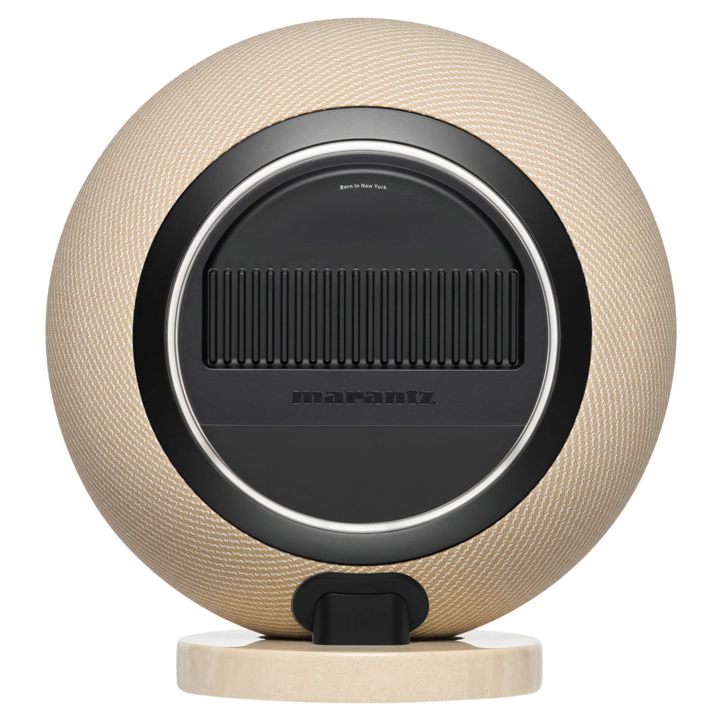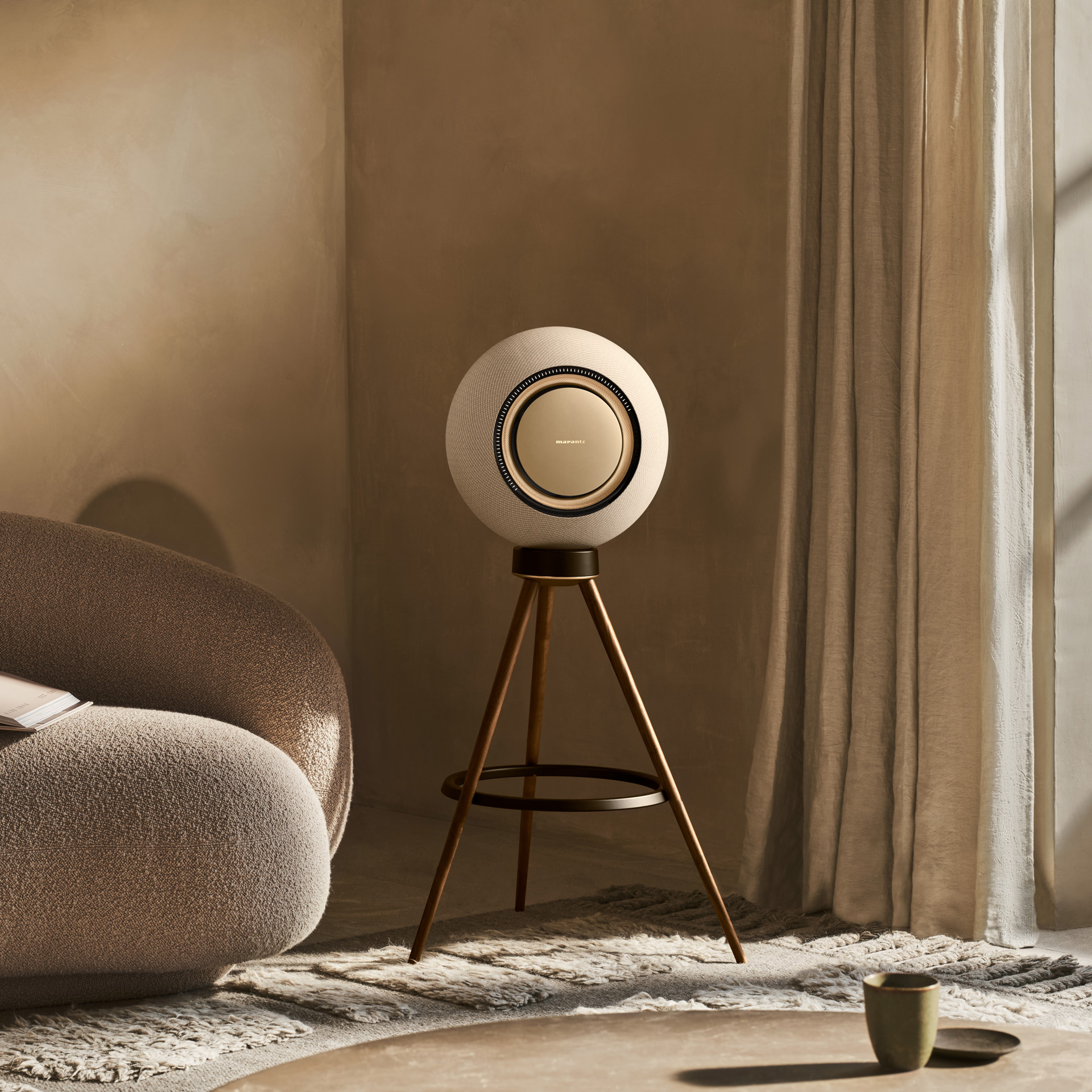 The optional tripod stand, elegantly crafted from American walnut and sturdy cast iron with a luxurious satin-black finish, is designed to reach the ideal listening height and perfectly complements the luxurious materials of Marantz Horizon.