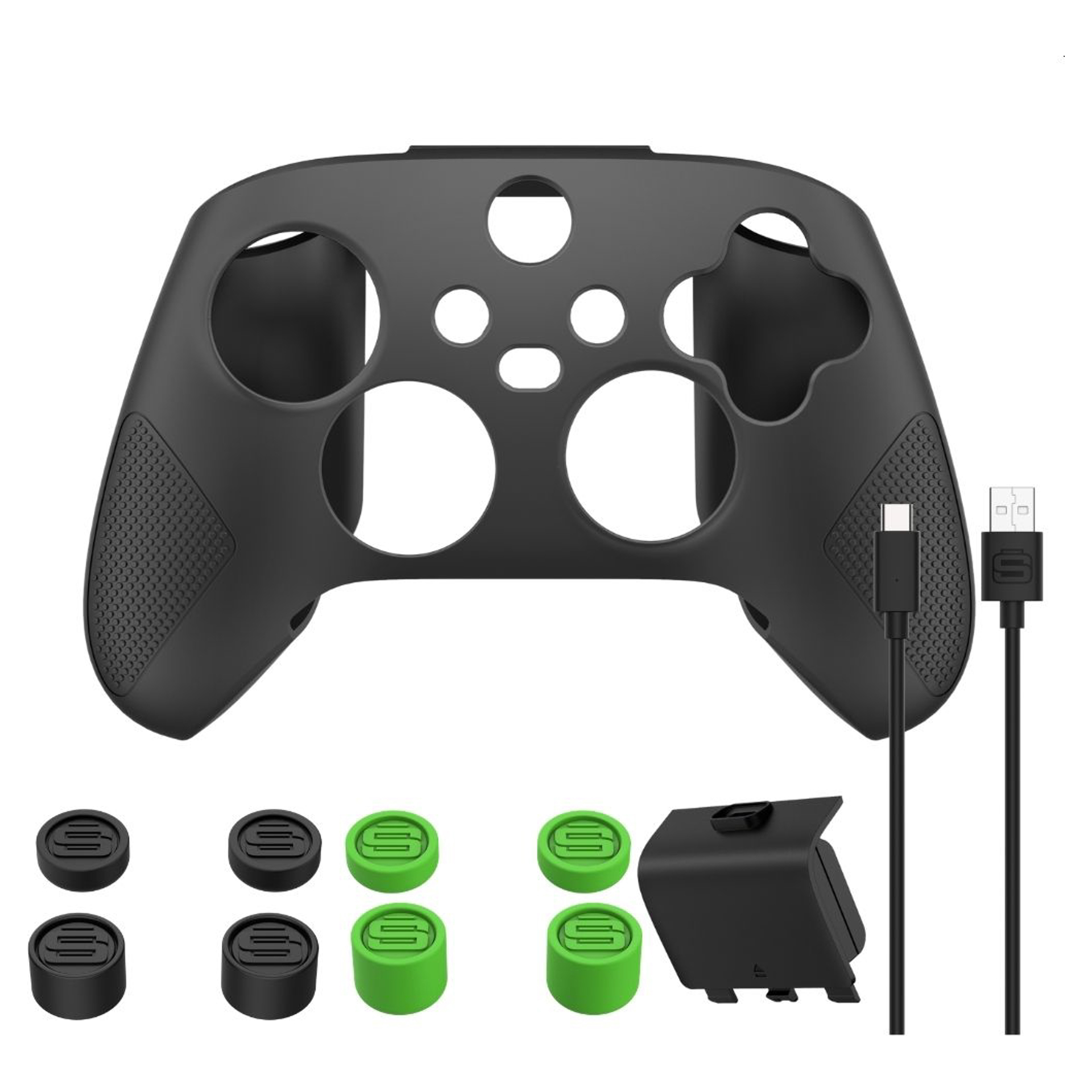 Everything you need to customize and upgrade your Xbox Series controller. A high-quality silicone controller skin and thumb grips provide added comfort so you can play longer without fatigue. A 10-foot cable and battery with play and charge capabilities keep you in the action and are ideal for long gaming sessions.