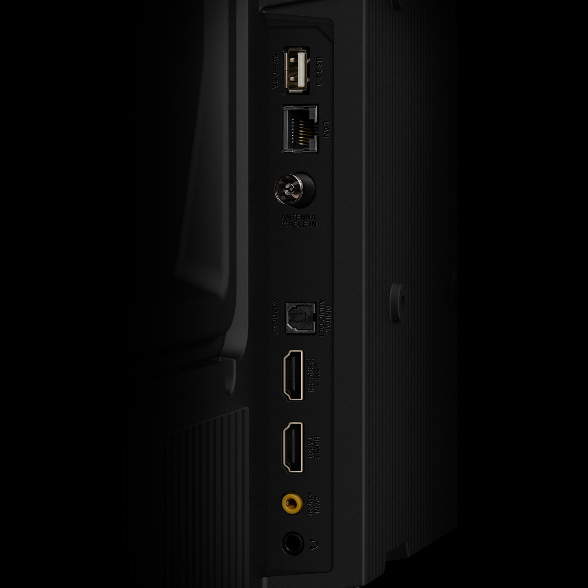 The TV includes a wide array of ports: two HDMI inputs (one with ARC support), one composite video input with stereo audio (3.5mm mini-jack), an optical digital audio output, a dedicated headphone jack, and a USB media port. This variety ensures broad compatibility with your home devices.