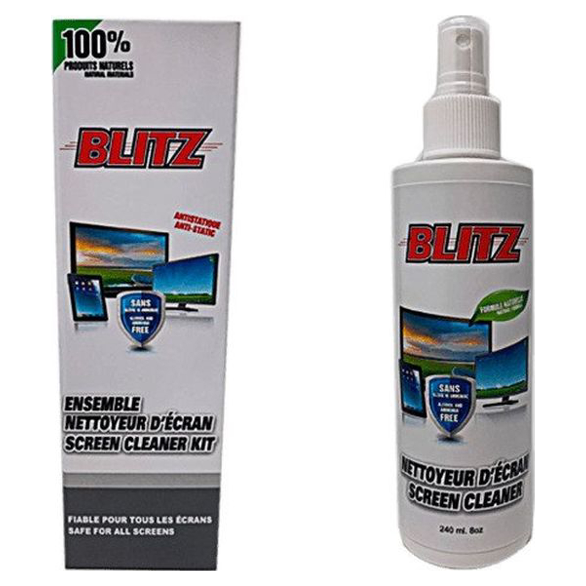 Screen cleaning kit, including 240ml bottle and cleaning cloth.