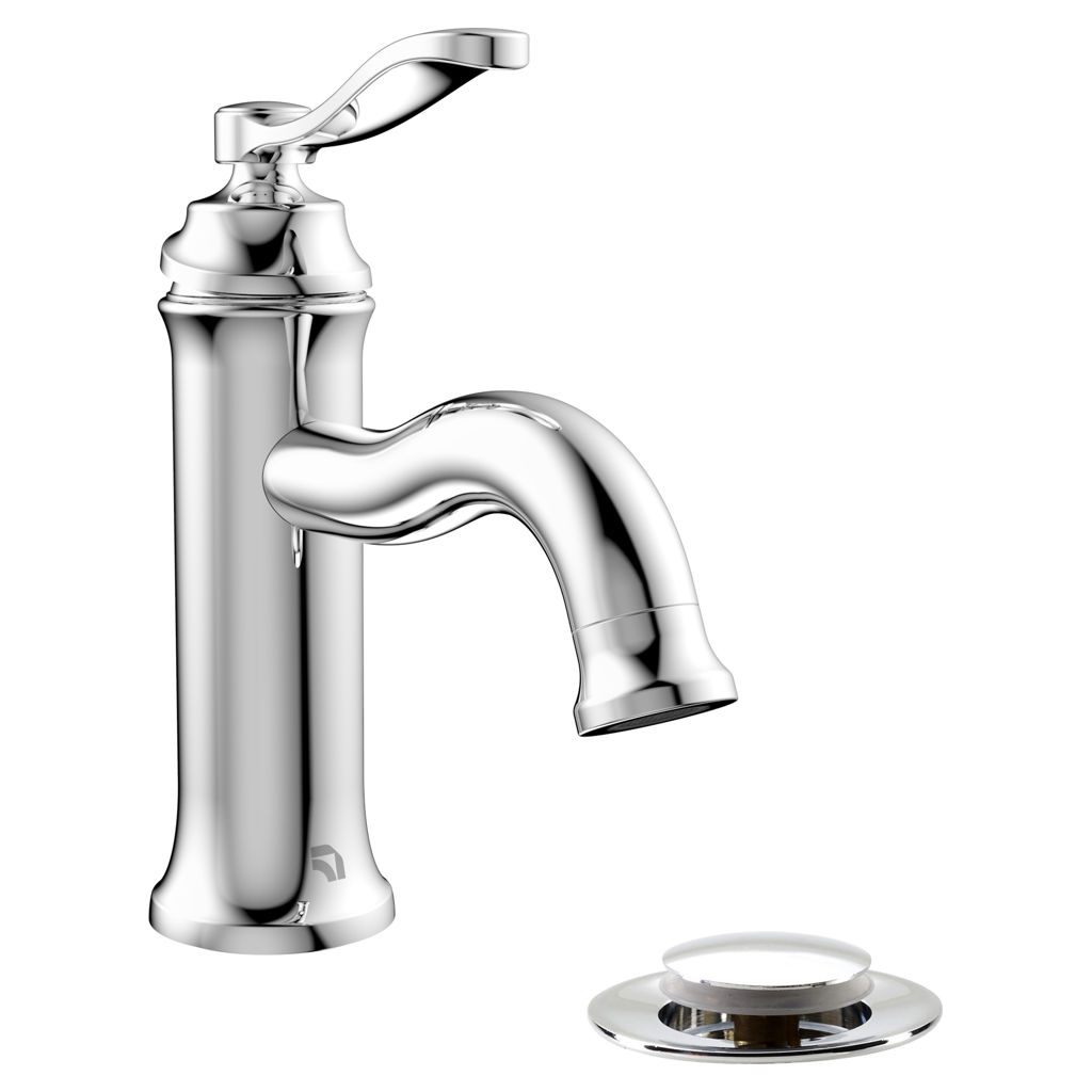 This single-hole bathroom faucet includes a Presto drain for practical, elegant installation.