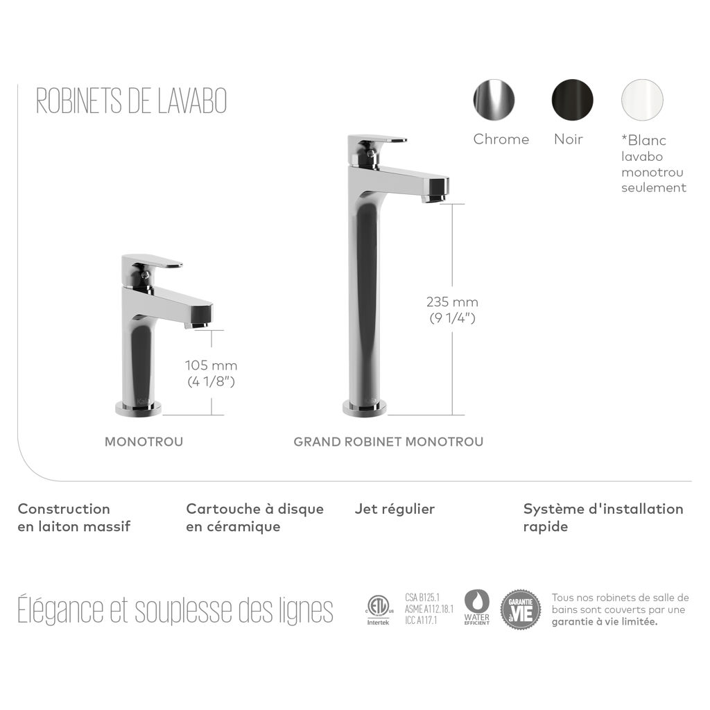 The classic curves of the Kontour collection are suitable for both urban and traditional environments. Easy to install and handle, choose the faucet or shower system that suits you with its discreet and elegant curves. And a well-kept secret, this collection is available in chrome, black and chrome, and even white and chrome for the sink faucet.