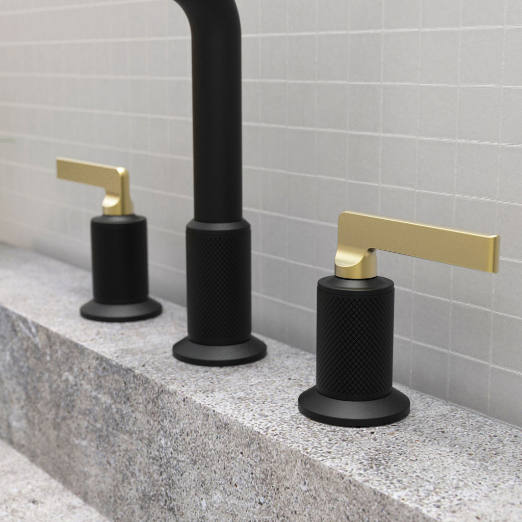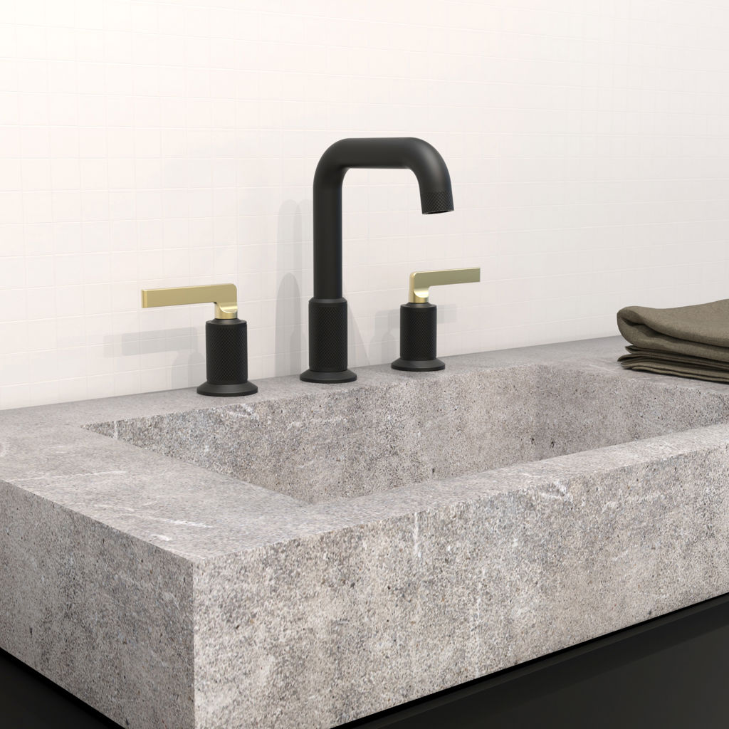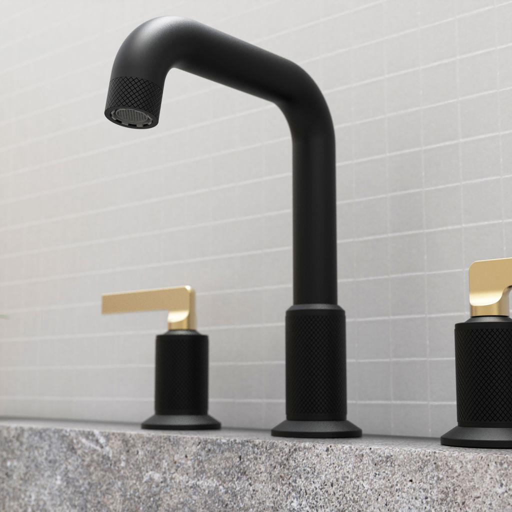 Its geometric lines end with finesse thanks to well-studied curves, creating the perfect industrial faucet with knurled accents, available for single hole, wide spread and centered installation.