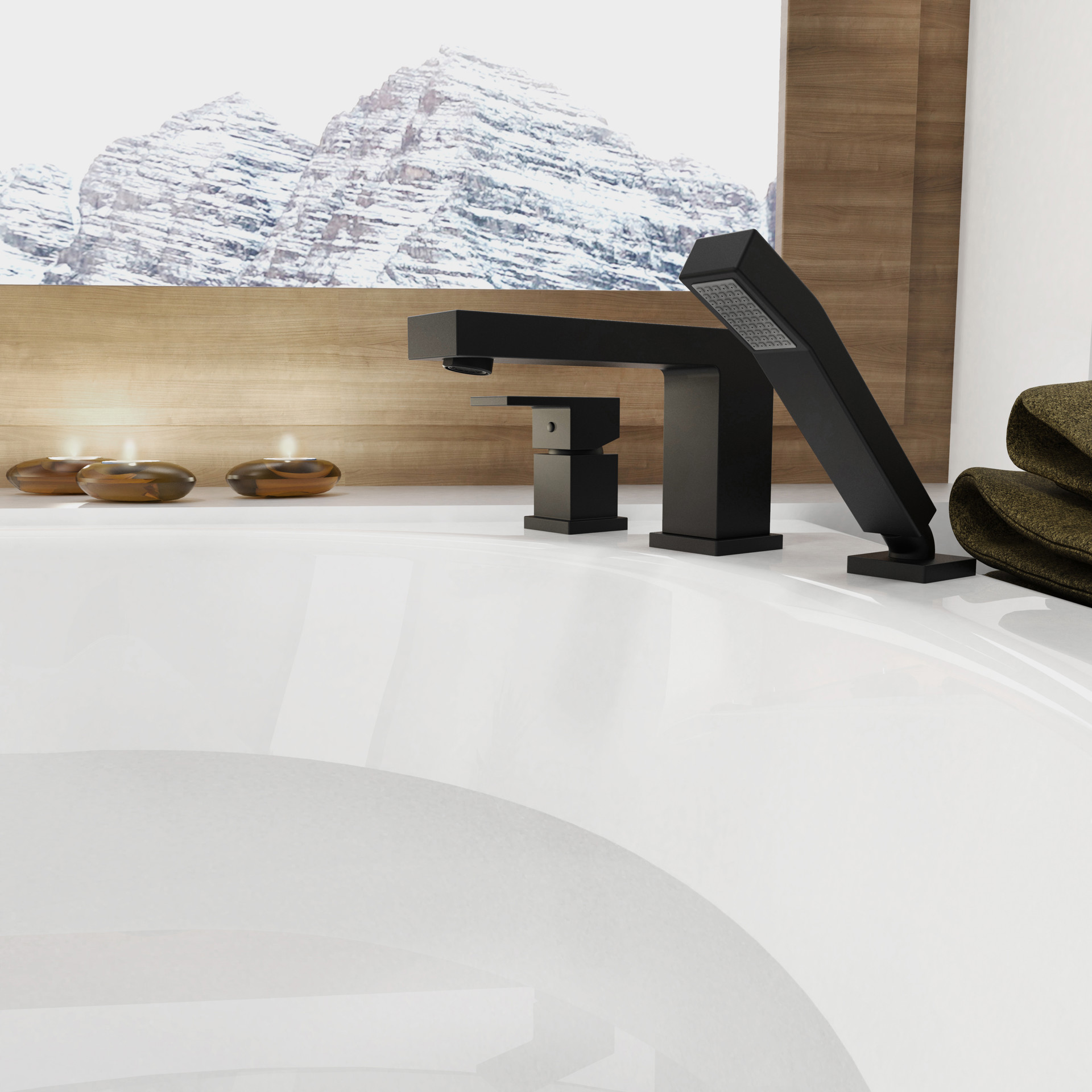 • Square, sleek lever handle, roman bathtub faucet with spray style hand shower.
