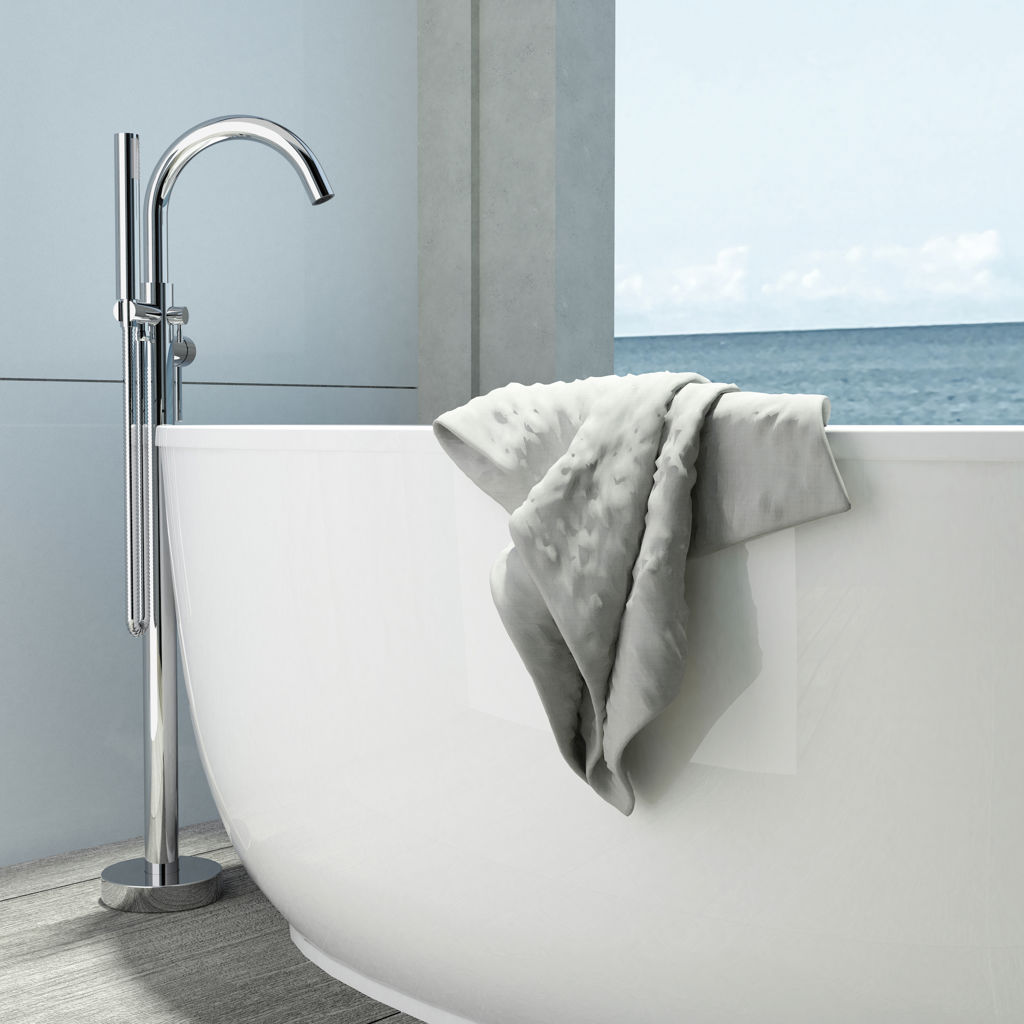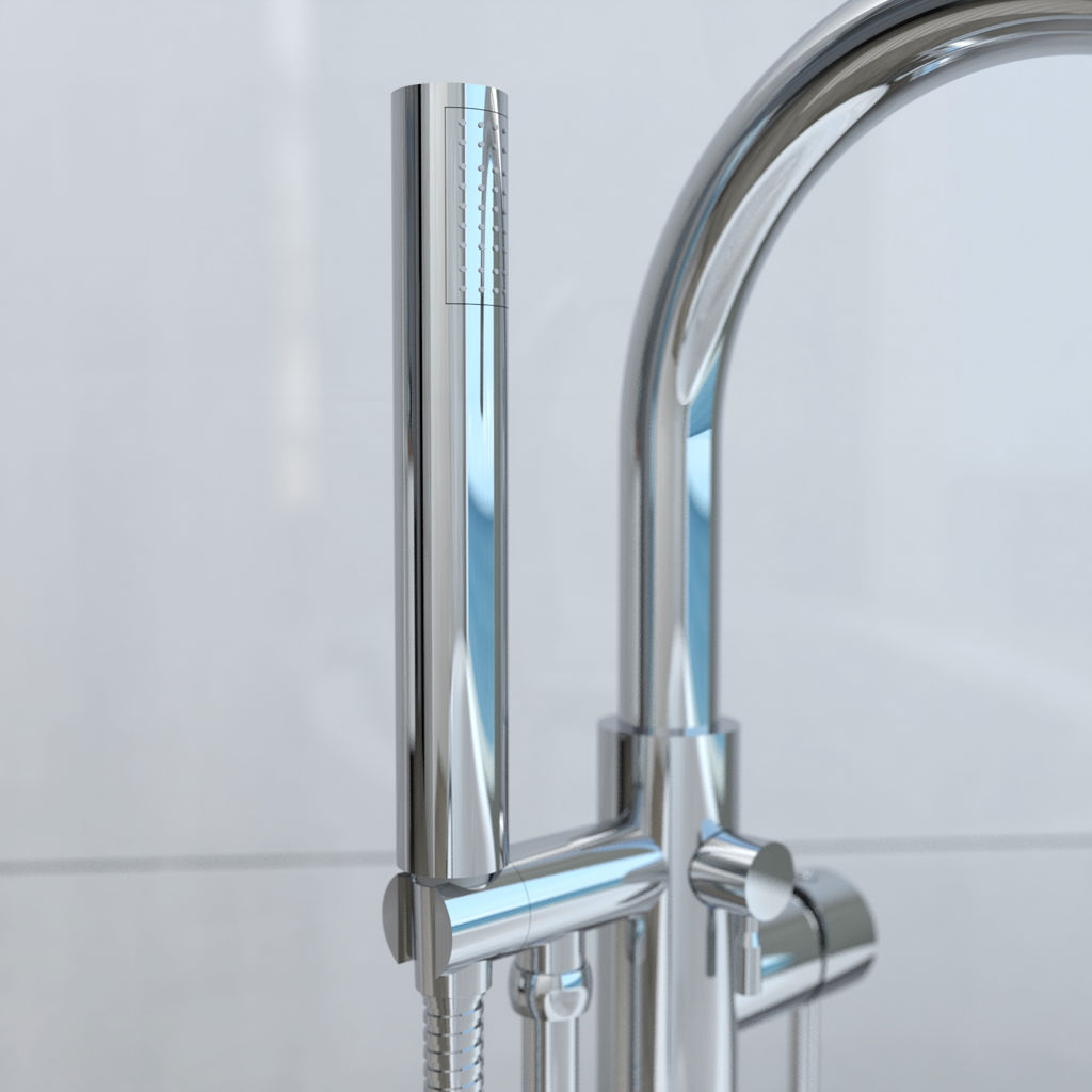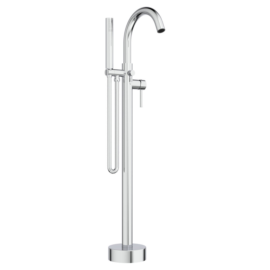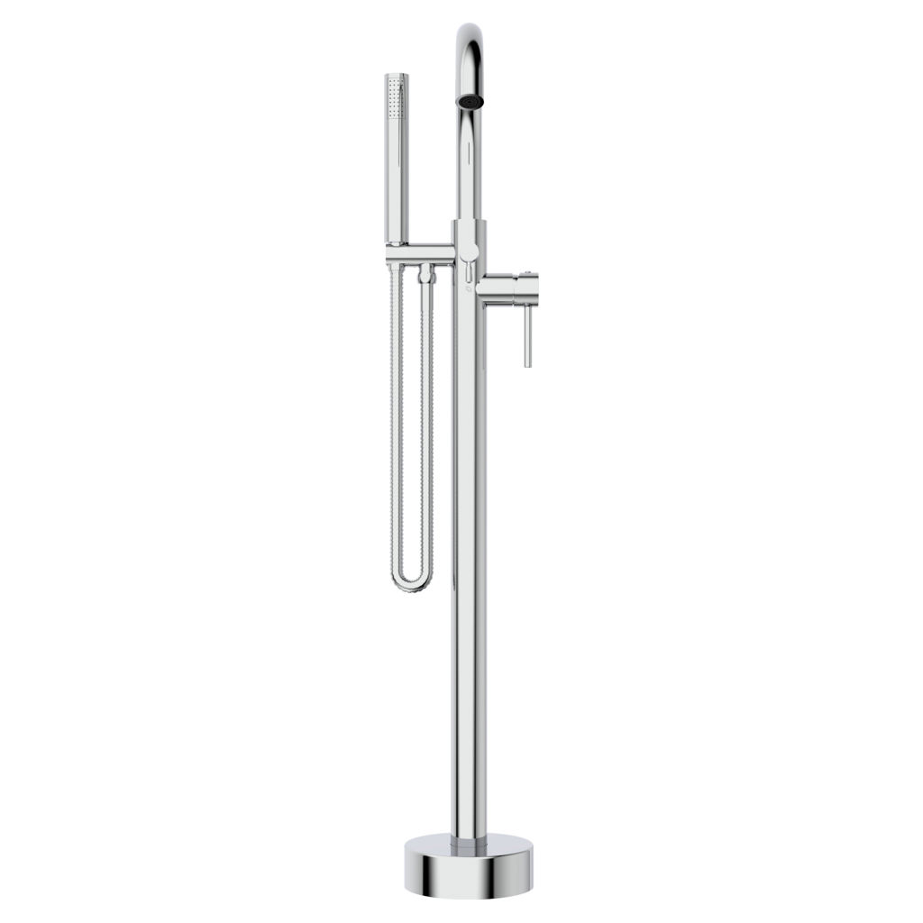 Round, cylindrical arch tub spout, floor mount bathtub filler with 2 way diverter and hand shower in chrome finish.