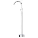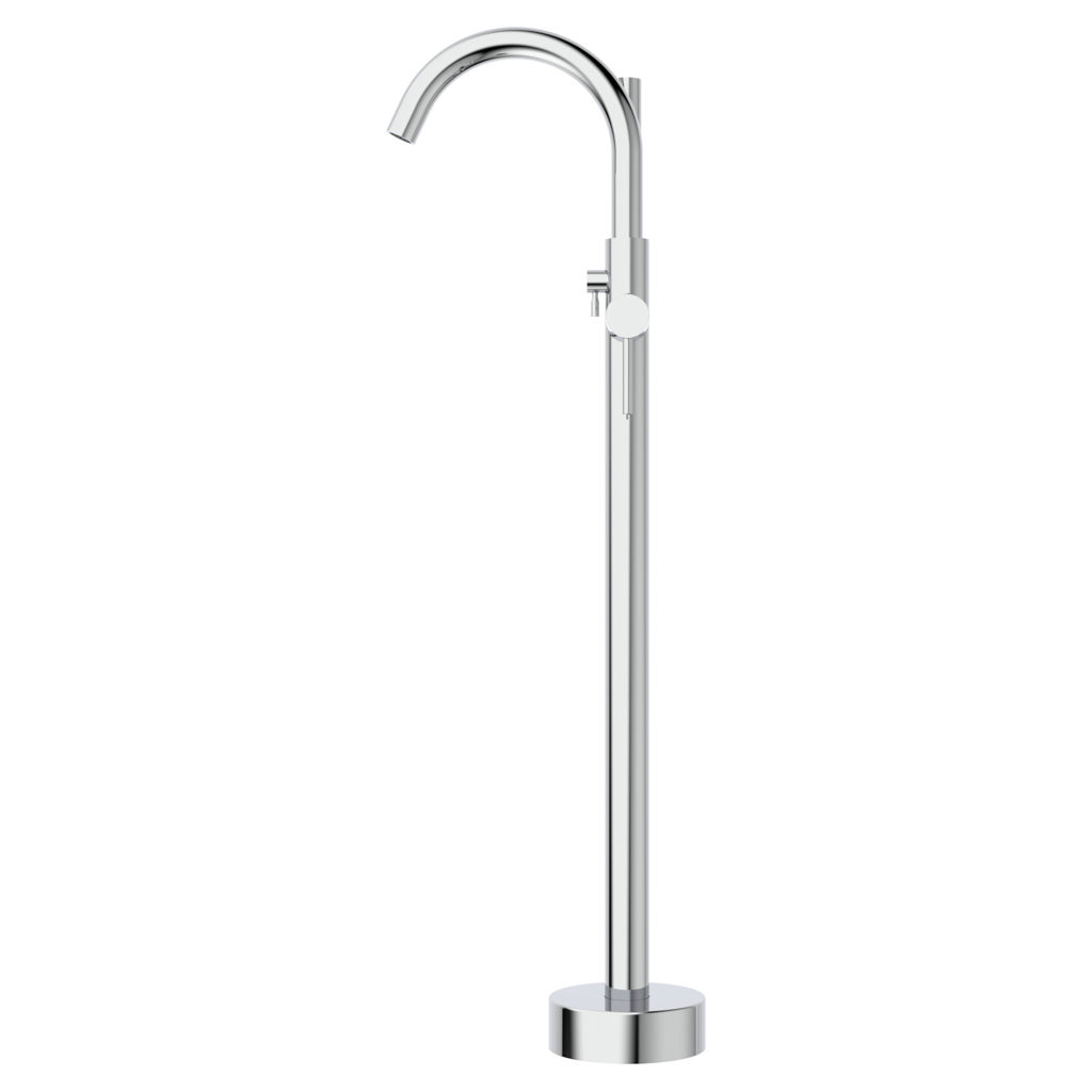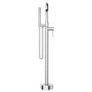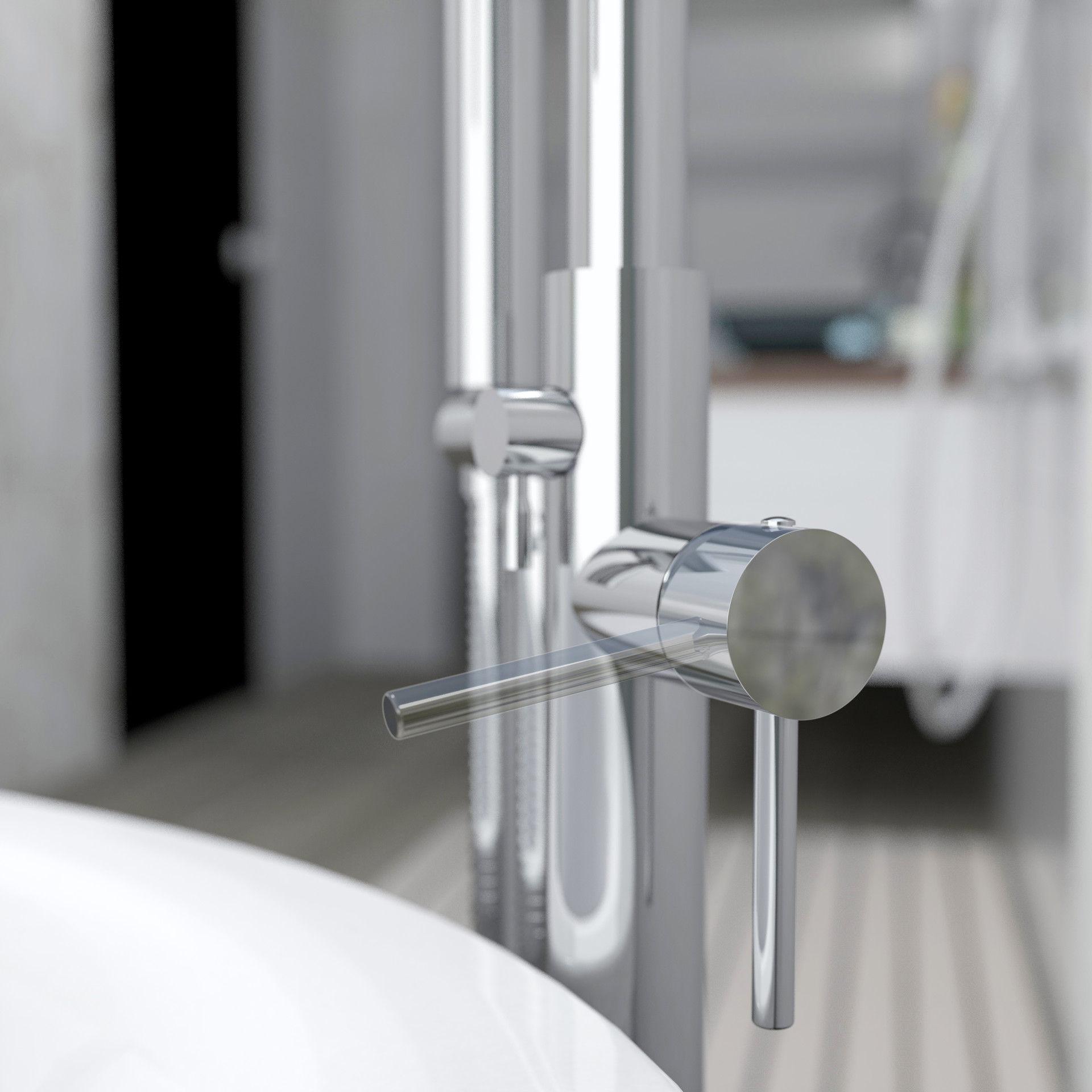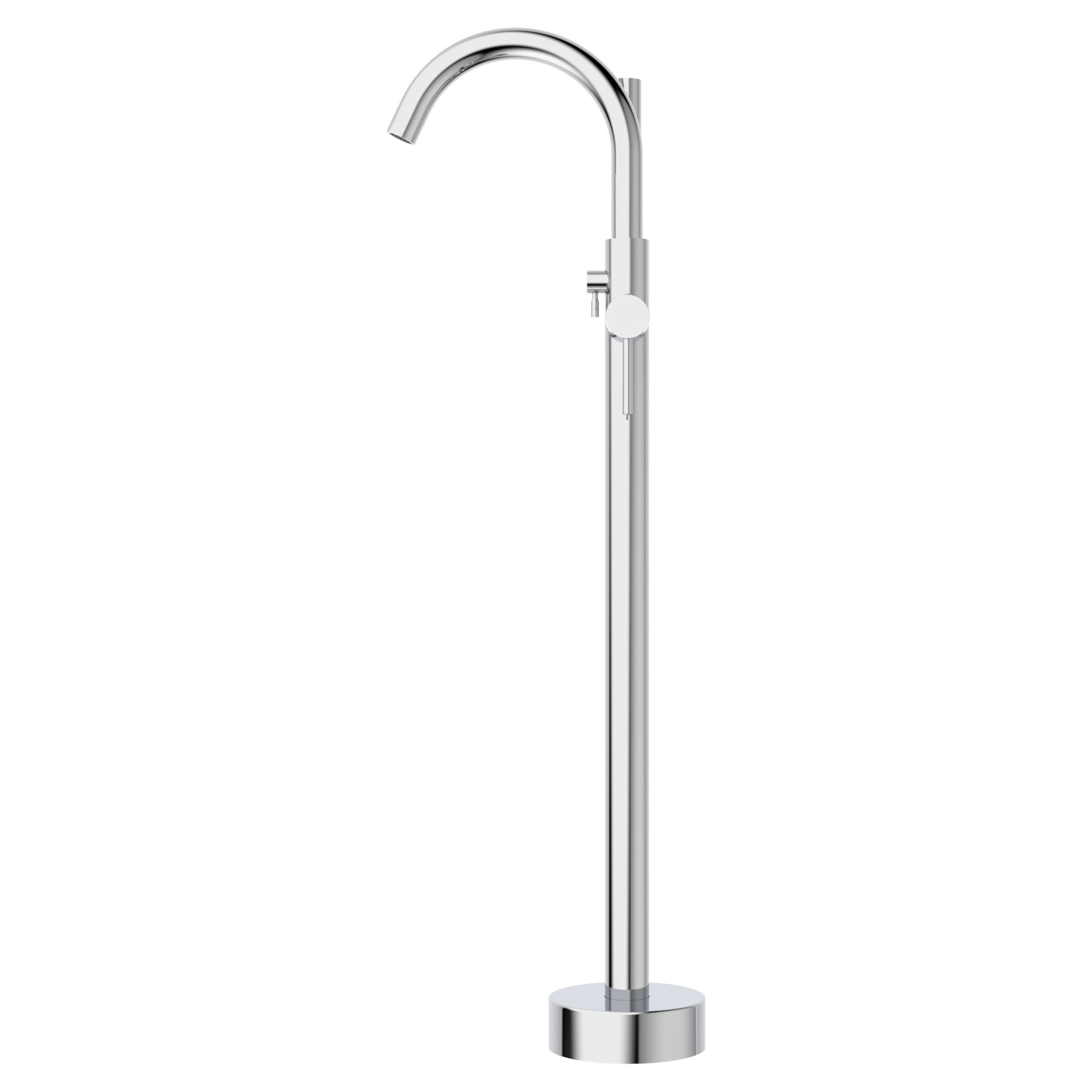 Round, cylindrical arch tub spout, floor mount bathtub filler with 2 way diverter and hand shower in chrome finish.