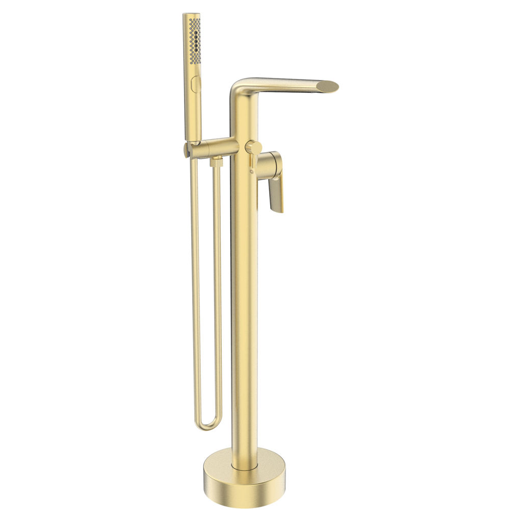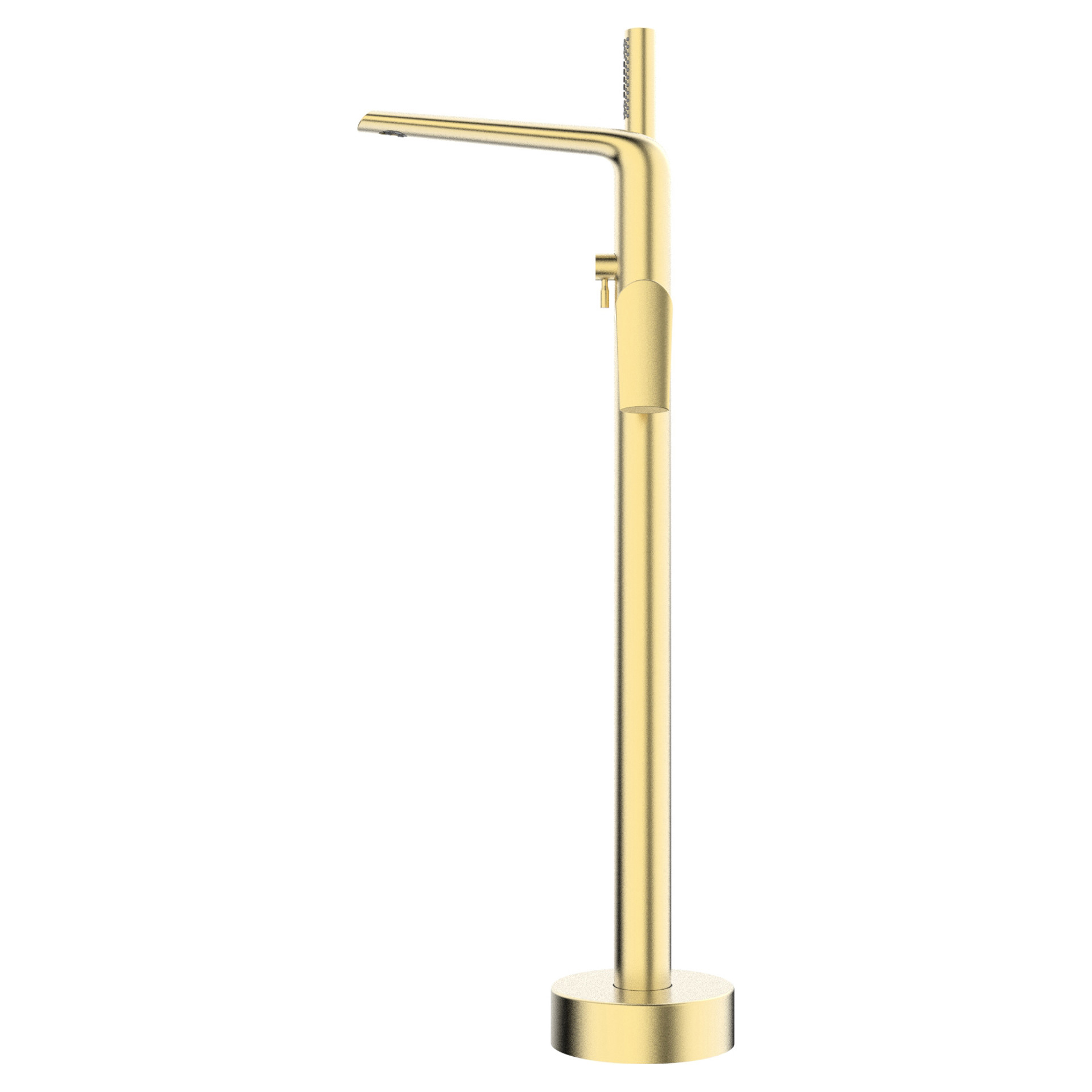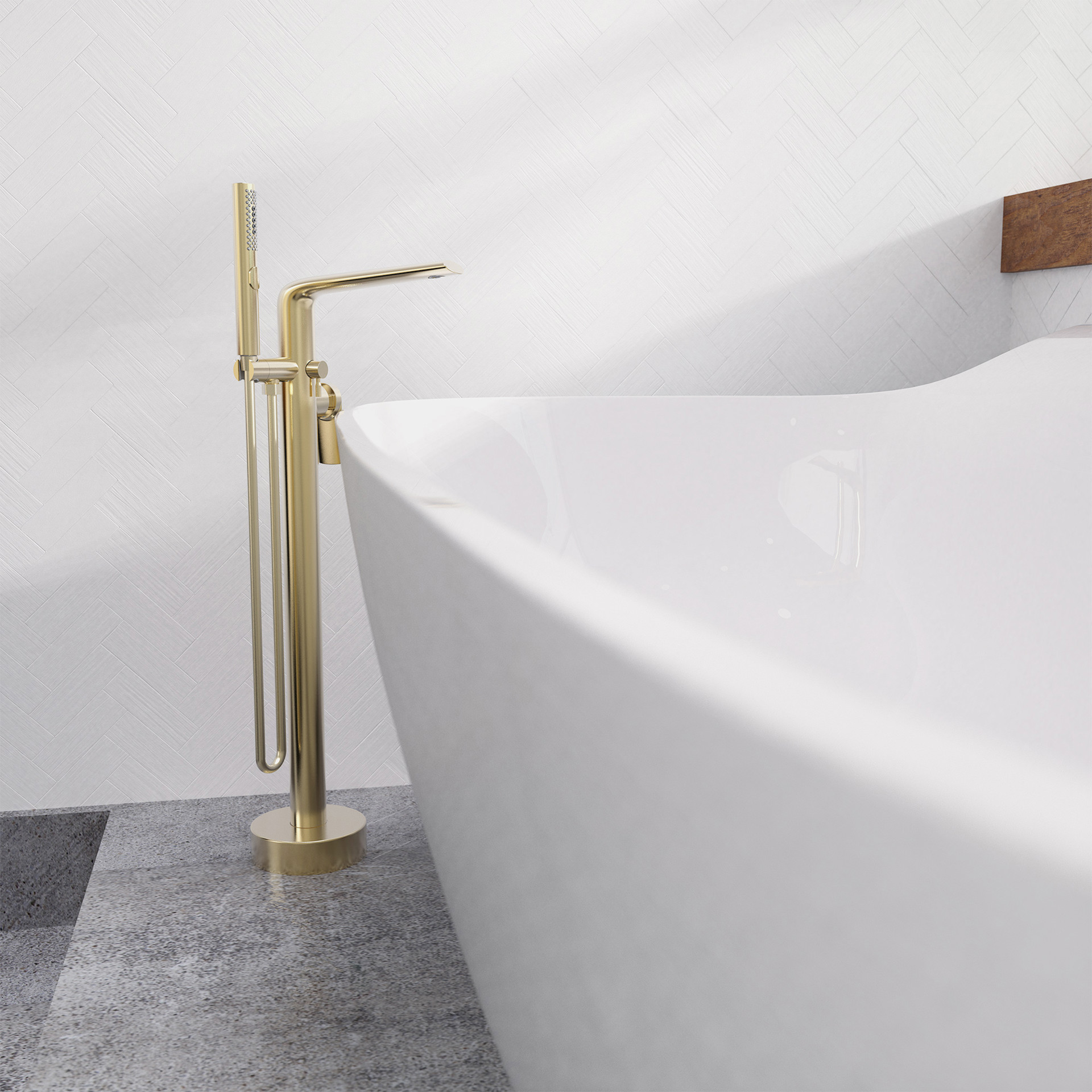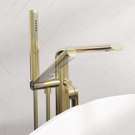 Its oval touch soften the angles of the give it a harmonious style to the floor mount bathtub filler with 2 way diverter and hand shower in matte gold finish.