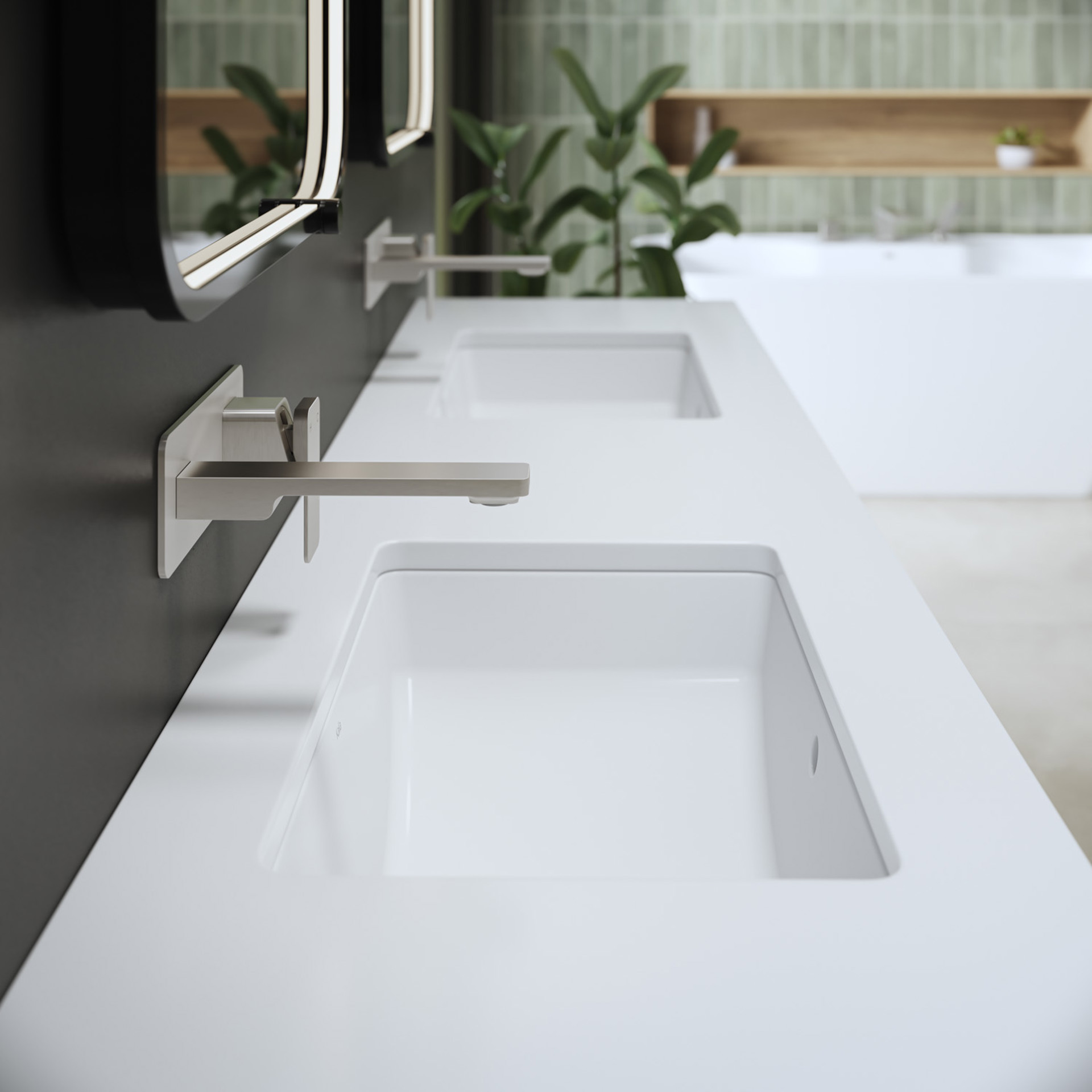 The Kareo wall-mount faucet (model BF1984-2) from Kalia showcases a sophisticated contemporary design with clean lines and a minimalist look. Crafted from solid brass, it offers long-lasting durability and premium quality while blending seamlessly into modern, streamlined décors.