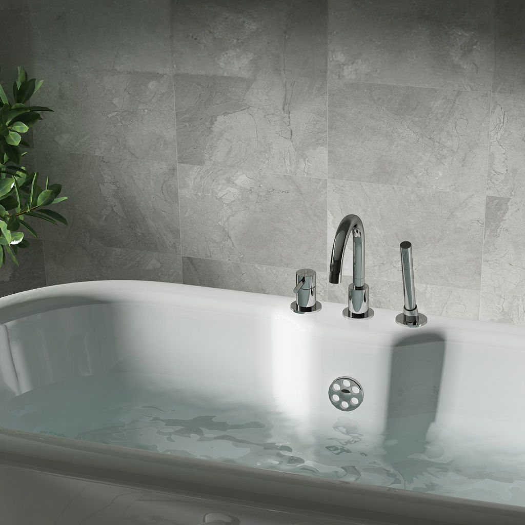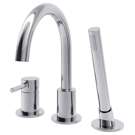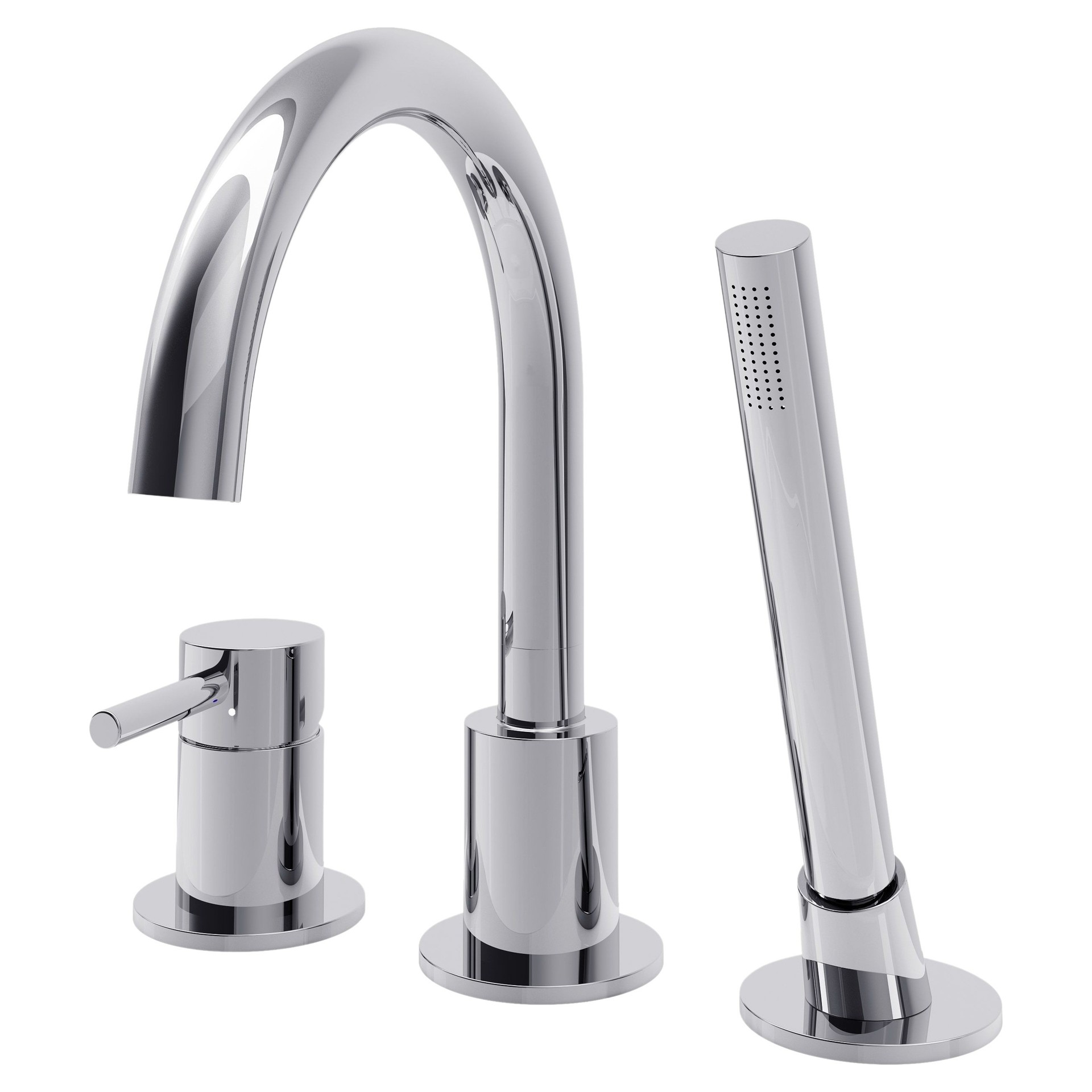 Elegant engineering in this modern bath faucet set represents the best of form and function. With an integrated Roman-style format designed to disguise itself, the decorative deck-mounted faucet conceals the extended pipes for the coordinated hand-held shower in the tub basin.