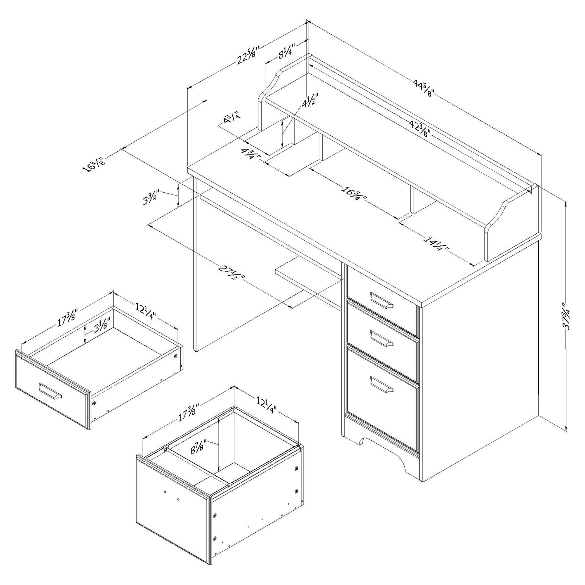 Pour un espace de travail organisé, classez vos articles de bureau dans les 2 tiroirs du haut et suspendez vos chemises de classement dans celui du bas. Les 3 tiroirs sont de différentes hauteurs pour répondre aux dimensions de plusieurs articles. La petite tablette fixe sous la surface de travail sert de rangement pour le portable lorsqu’il n’est pas utilisé. L’autre tablette située aux pieds est destinée à supporter des livres plus rarement utilisés.